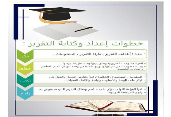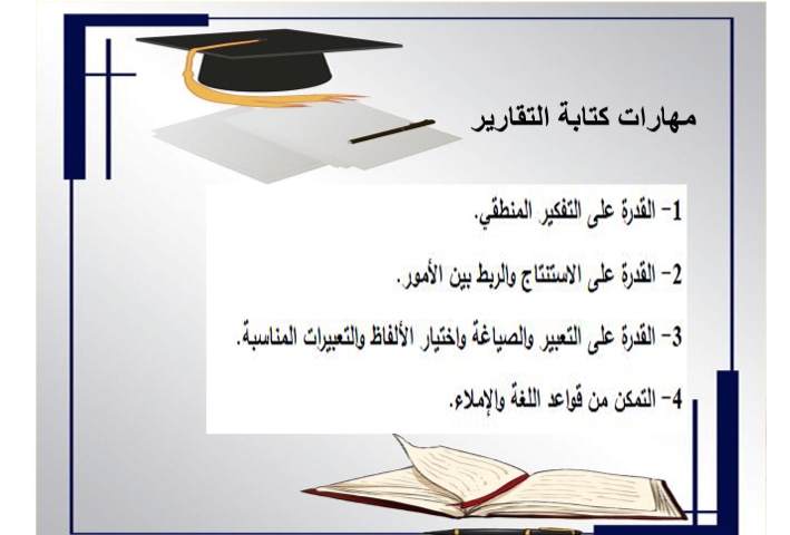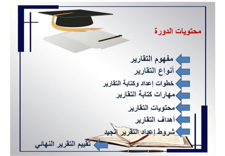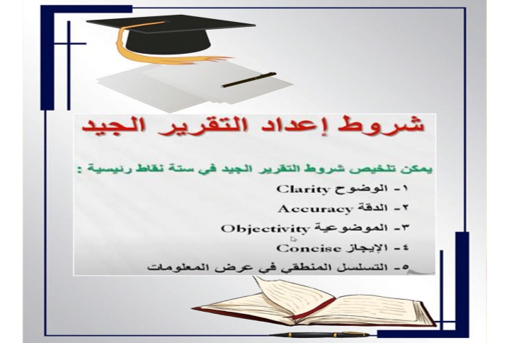 كما تناولت الورشة أيضًا محتويات التقارير وأهدافها وشروط إعداد التقرير الجديد بالإضافة إلى كيفية تقييم التقرير النهائي ووضحت الدكتورة كذلك أهمية الوضوح والدقة والموضوعية والإيجاز والتسلسل المنطقي في إعداد التقرير الجيد؛ وكذلك دور التمكن من قواعد اللغة والإملاء.