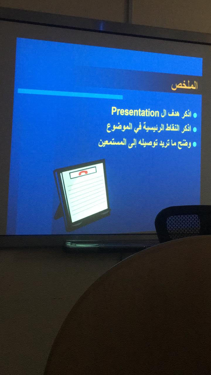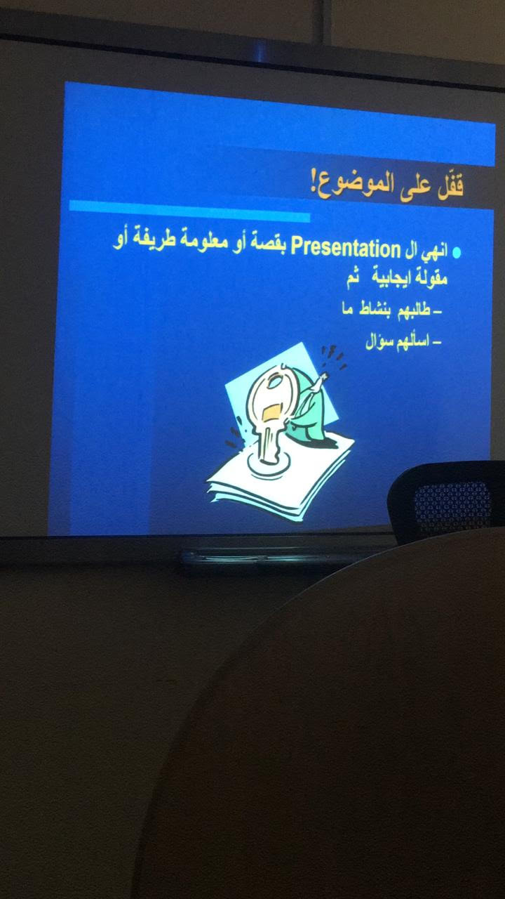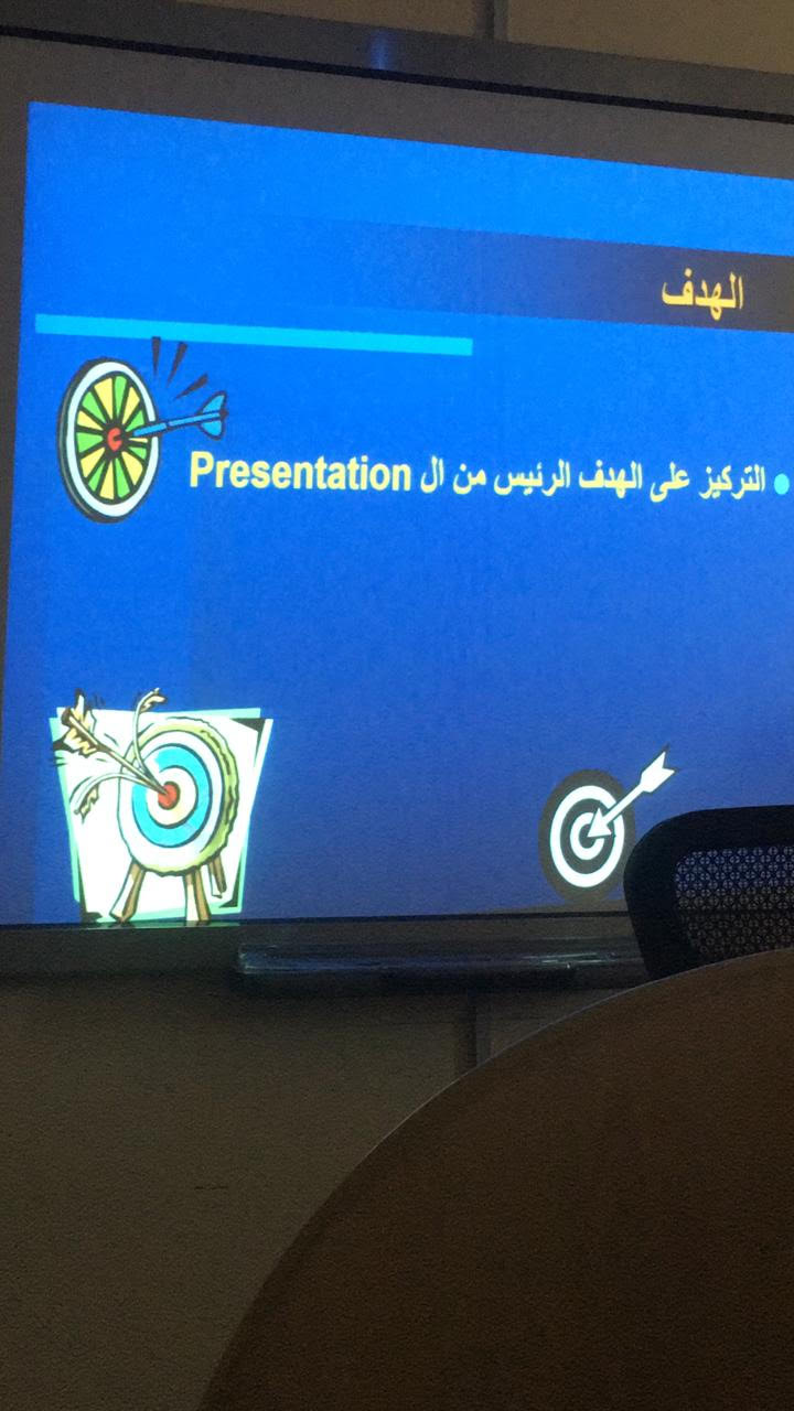 وذلك لتعريف الطالبات وتدريبهم على طريقة عرض مشاركاتهم والجوانب التي يجب عليهن التركيز عليها وأسباب التوتر من العرض وطرق التغلب على التوتر أثناء العرض، كما أوضحت الدكتورة جيهان للطالبات العديد من المهارات التي تسهم في تنمية وتقويه مهارات العرض والتقديم، وكيف يمكن للطالبة أن تصبح متميزة في طريقة عرضها للموضوع.