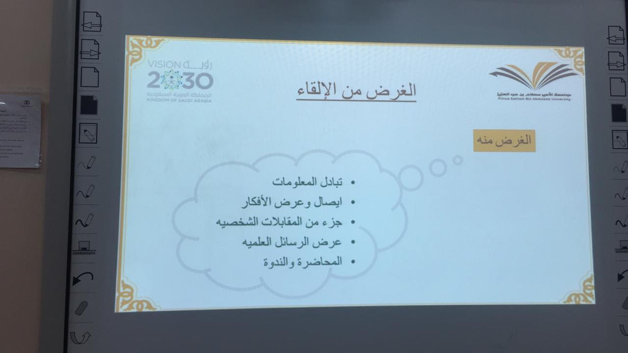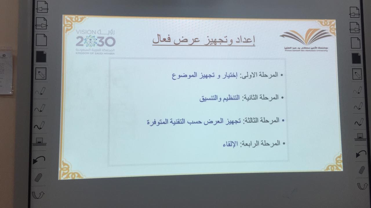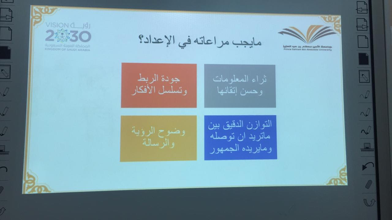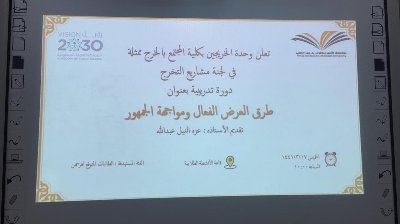أقامت وحدة الخريجين في كلية المجتمع ممثله في لجنة مشاريع التخرج يوم الخميس الموافق 17 /3/ 1441هـ دورة، تدريبيه بعنوان "طرق العرض الفعال ومواجهة الجمهور " من تقديم الأستاذة /عزه النيل عبدالله ؛ منسقة لجنة مشاريع التخرج بالكلية واستهدفت الدورة الطالبات المتوقع تخرجهن حيث تناولت الأستاذة عدد من المحاور كان من أهمها طرق العرض الفعال وكيفية تجهيزه واختيار وتناسق الموضوعات وكيفية الإلقاء وما يجب مراعاته في الإلقاء. كما تم تناول مكونات عرض مشاريع التخرج وشرحها بالتفصيل. ووجدت الدورة تفاعل من الطالبات كما اجابت الأستاذة عزه على جميع استفسارات وأسئلة الطالبات.