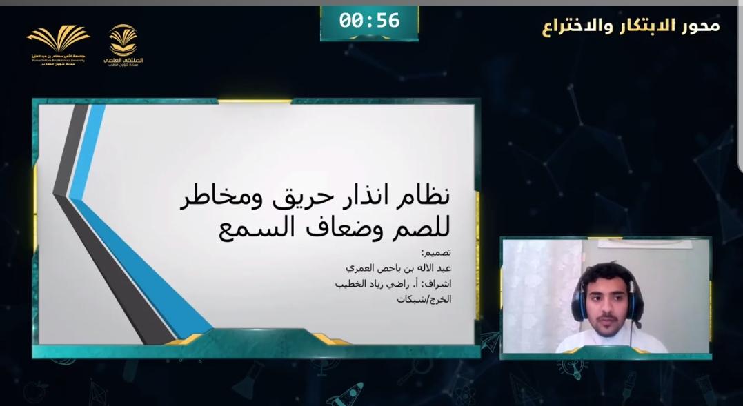 في إطار مشاركة كلية المجتمع بالخرج في الملتقى العلمي للطلاب الذي نظمته عمادة شؤون الطلاب (عن بعد) يومي الأحد والأثنين الموافق 8-9/8/1442هـ حصلت الكلية على المركز الثالث في محور الابتكارات والاختراعات عن مشاركة بعنوان "نظام انذار حريق ومخاطر لفئة الصم وضعف السمع" للطالب / عبدالله بن باحص العمري وتحت إشراف أ. راضي زياد الخطيب المحاضر بقسم الحاسب الآلي بالكلية.
