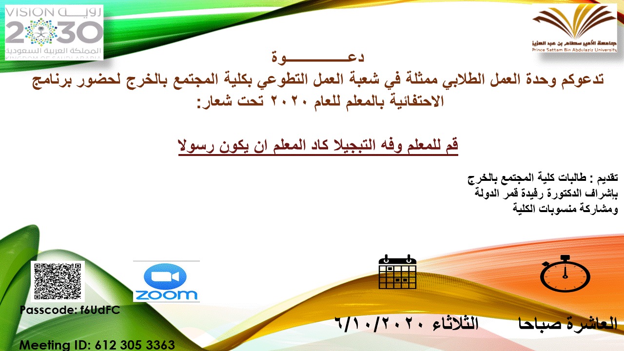 بمناسبة اليوم العالمي للمعلم نظمت وحدة العمل الطلابي ممثلة في شعبة العمل التطوعي في كلية المجتمع بالخرج وبإشراف الدكتورة/ رفيدة قمر الدولة محمد؛ يوم الثلاثاء الموافق 19-2-1442هـ احتفالية –عبر برنامج الزوم- من تقديم وتنفيذ طالبات الكلية.