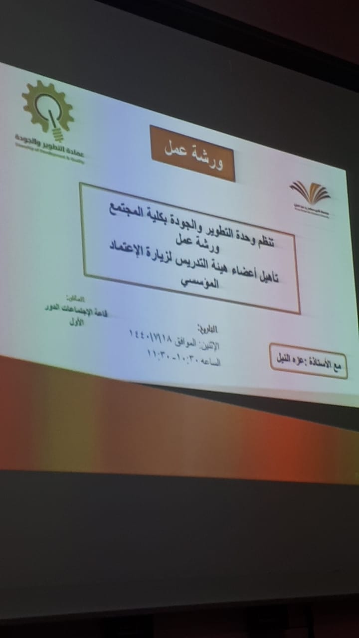 بحضور من وكيلة كلية المجتمع بالخرج الدكتورة/ أمينه بنت عبدالرحمن المشحن. أقامت وحدة التطوير والجودة بالكلية محاضرة تعريفية بعنوان: ( تأهيل أعضاء هيئة التدريس لزيارة الاعتماد المؤسسي ) وذلك يوم الأثنين الموافق ١٨/ ٧/ ١٤٤٠ هـ، قدمتها مساعدة الوكيلة للتطوير والجودة الأستاذة /عزه النيل.
