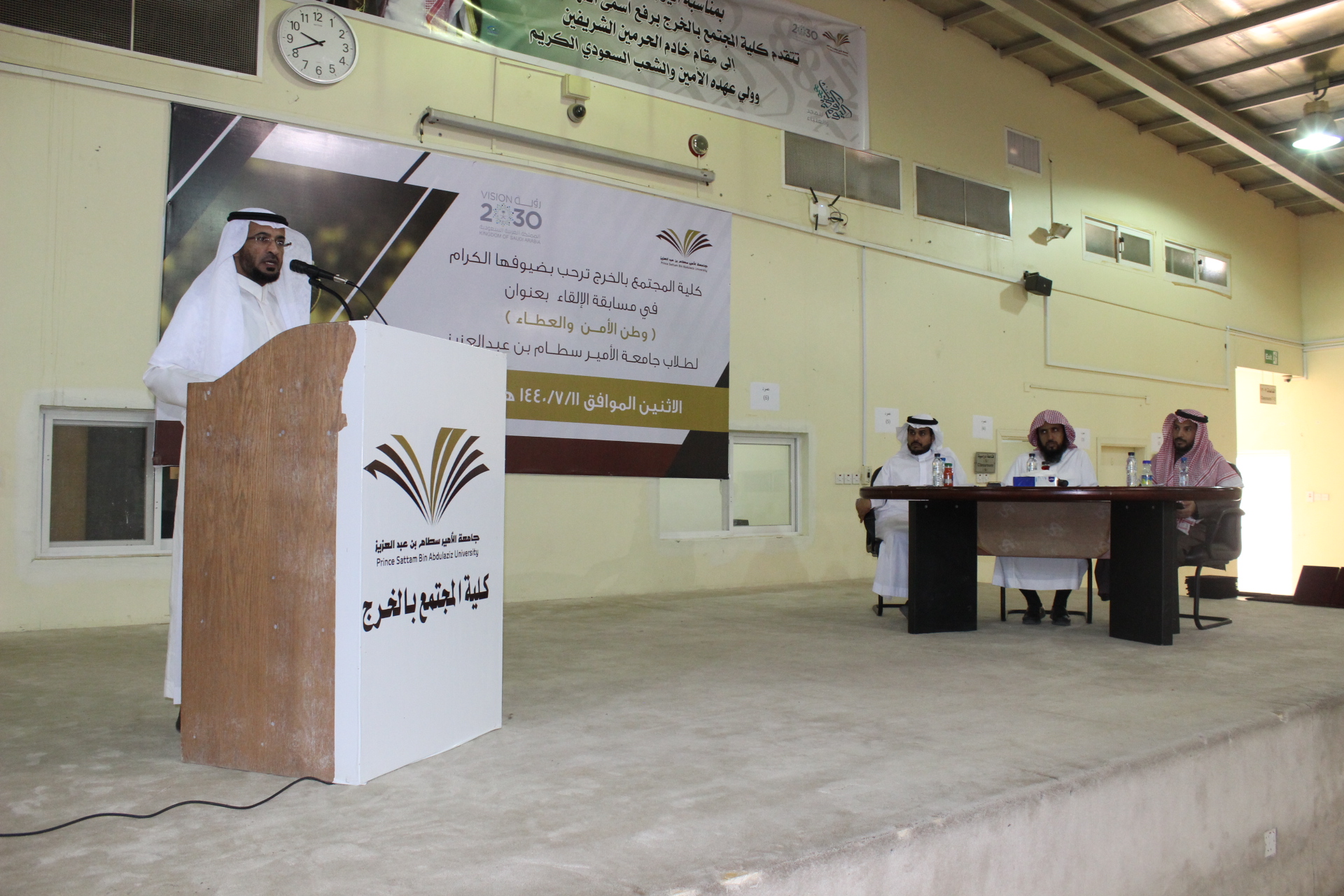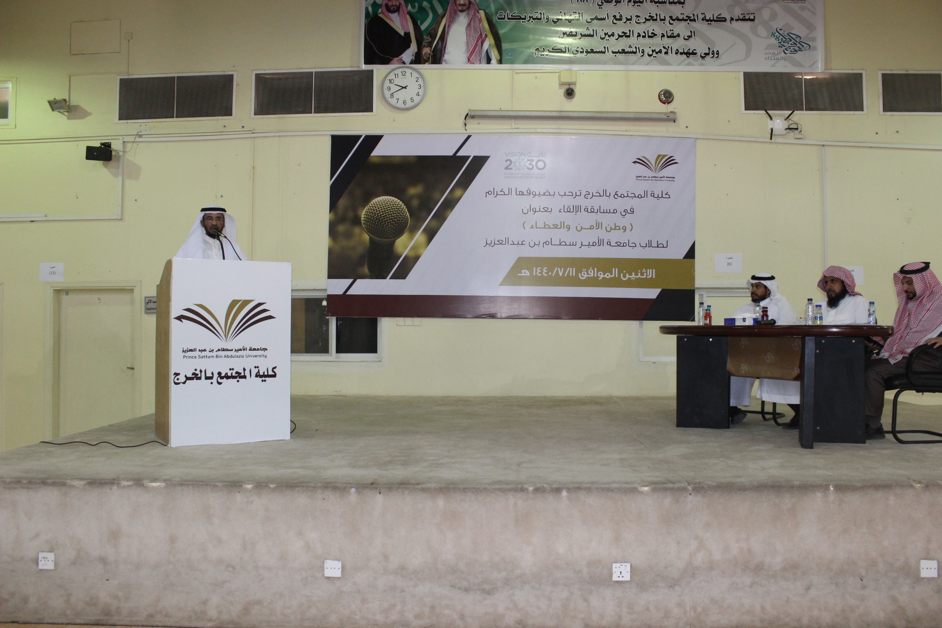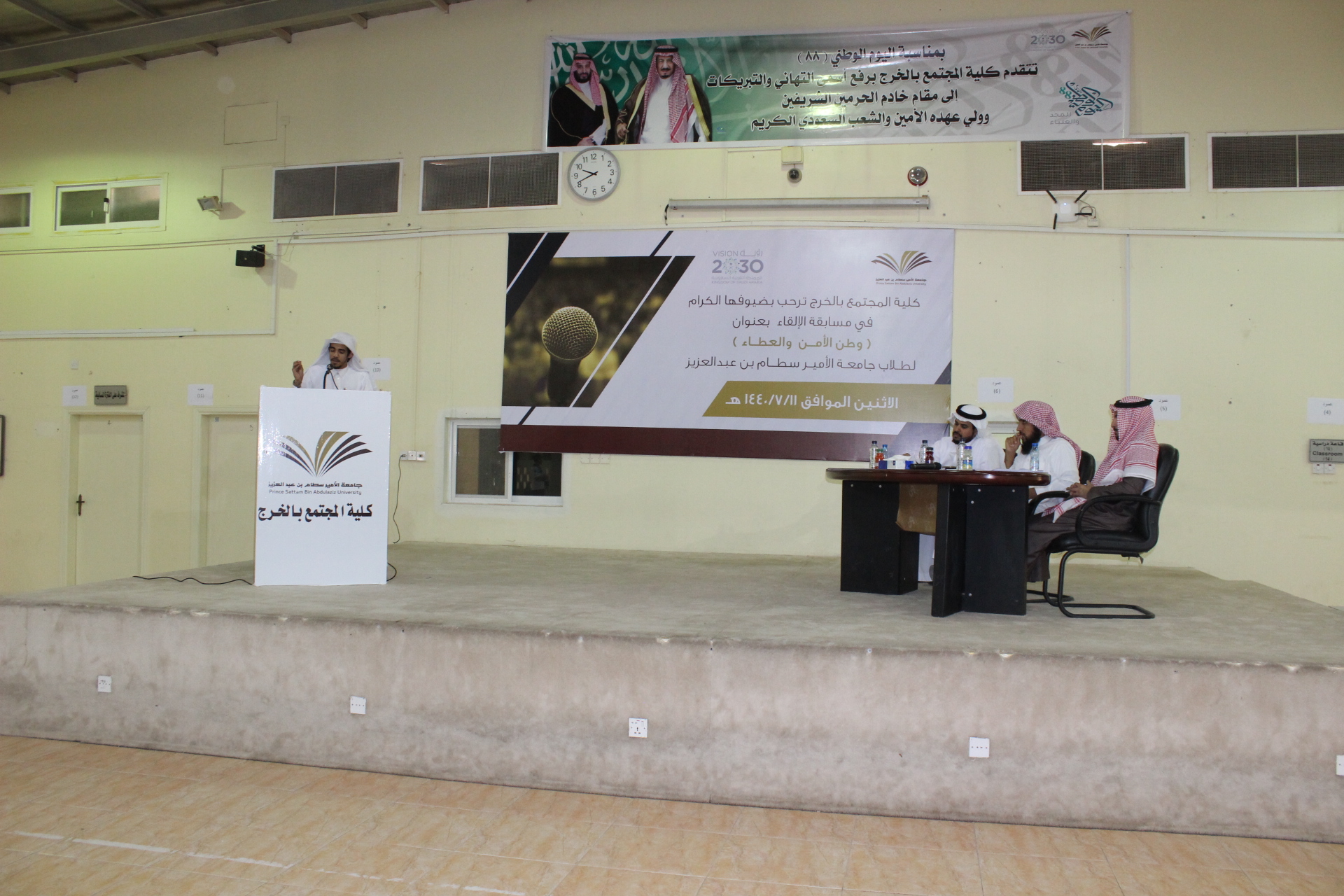 اختتمت كلية المجتمع بالخرج ممثلة بلجنة الوعي الفكري المسابقة الجامعية الإلقائية "وطن الأمن والعطاء" , التي شهدت المسابقة مشاركة فاعلة من طلاب عدد من كليات الجامعة , وقد أشرفت وحدة الوعي الفكري بالجامعة على تحكيم مشاركات الطلاب , التي أبرزت دور المملكة العربية السعودية الريادي في العالم في الكثير من المجالات.