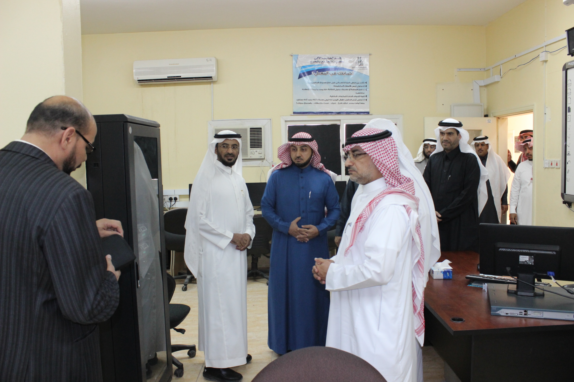 ومن ناحية أخرى أعرب وكيل الجامعة عن سعادته البالغة بحضور هذا الحفل وعلى ما تشهده الكلية من انجازات واضحة وملموسة حيث قام سعادته برفقة عميد الكلية الدكتور/ حمد بن عبدالله القميزي بجولة في الكلية للوقوف على التطورات في المعامل والبنية الأساسية والخدمات الالكترونية المقدمة للطلاب من خلال نقاط الإنترنت المتاحة ببهو الكلية.
