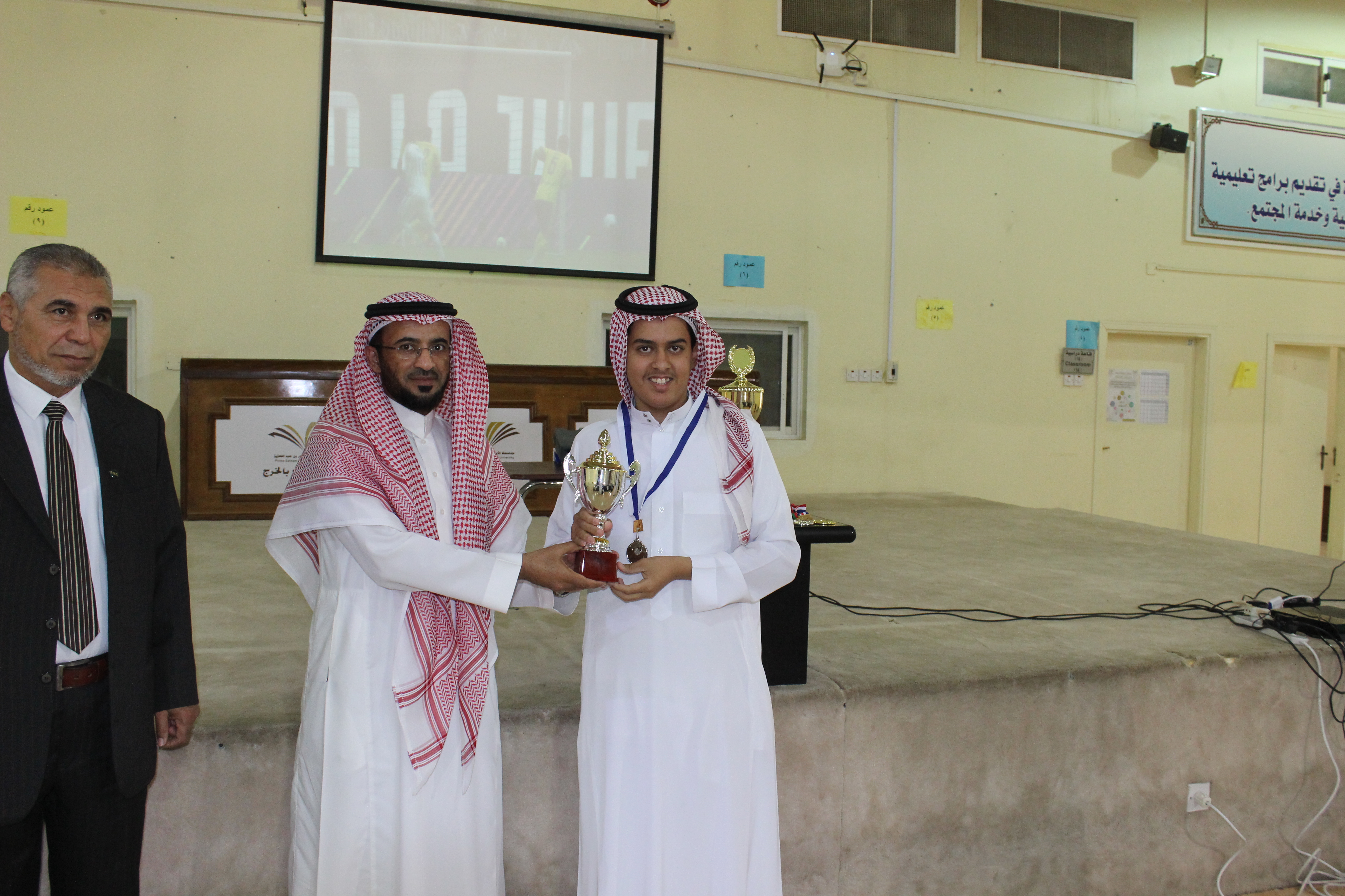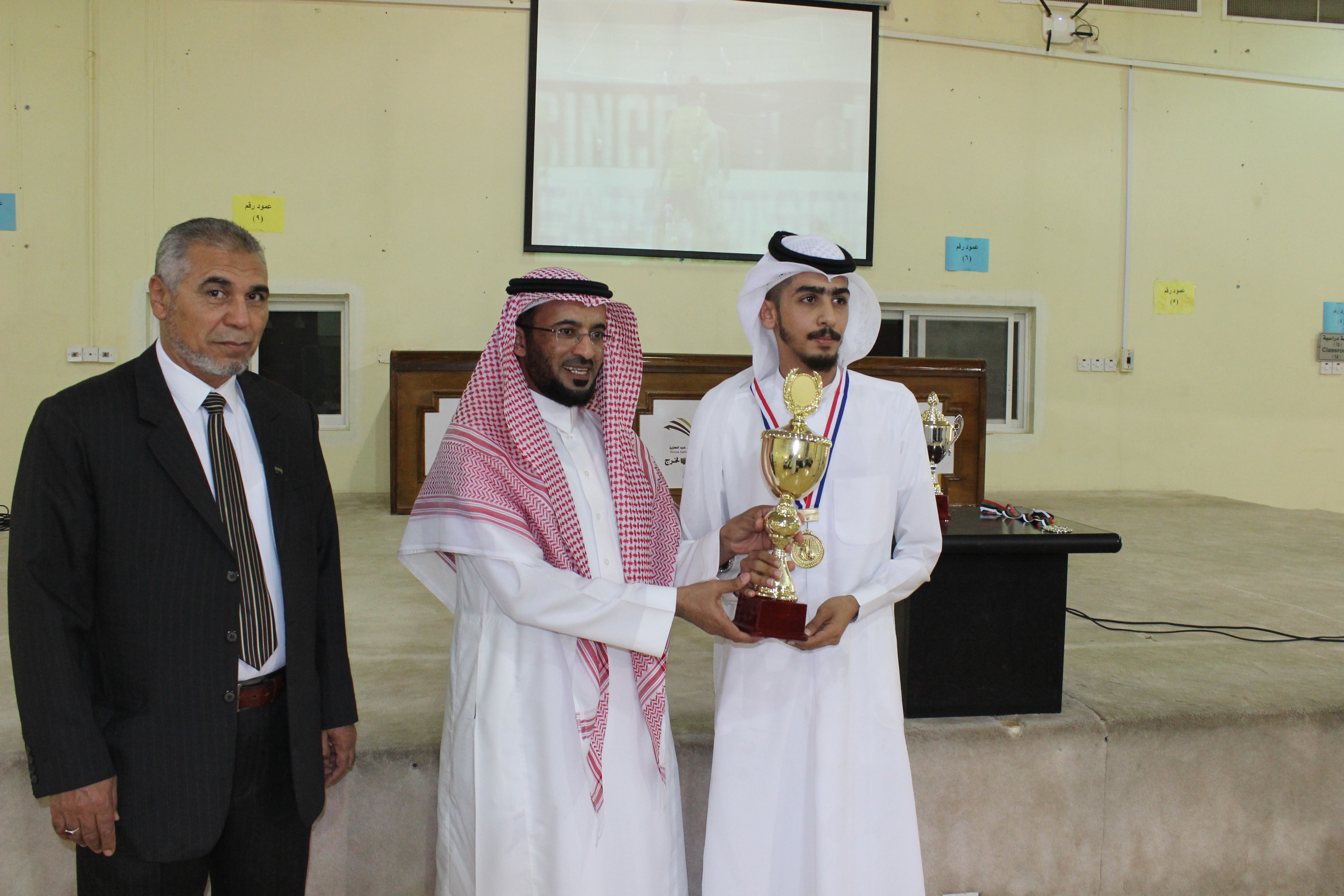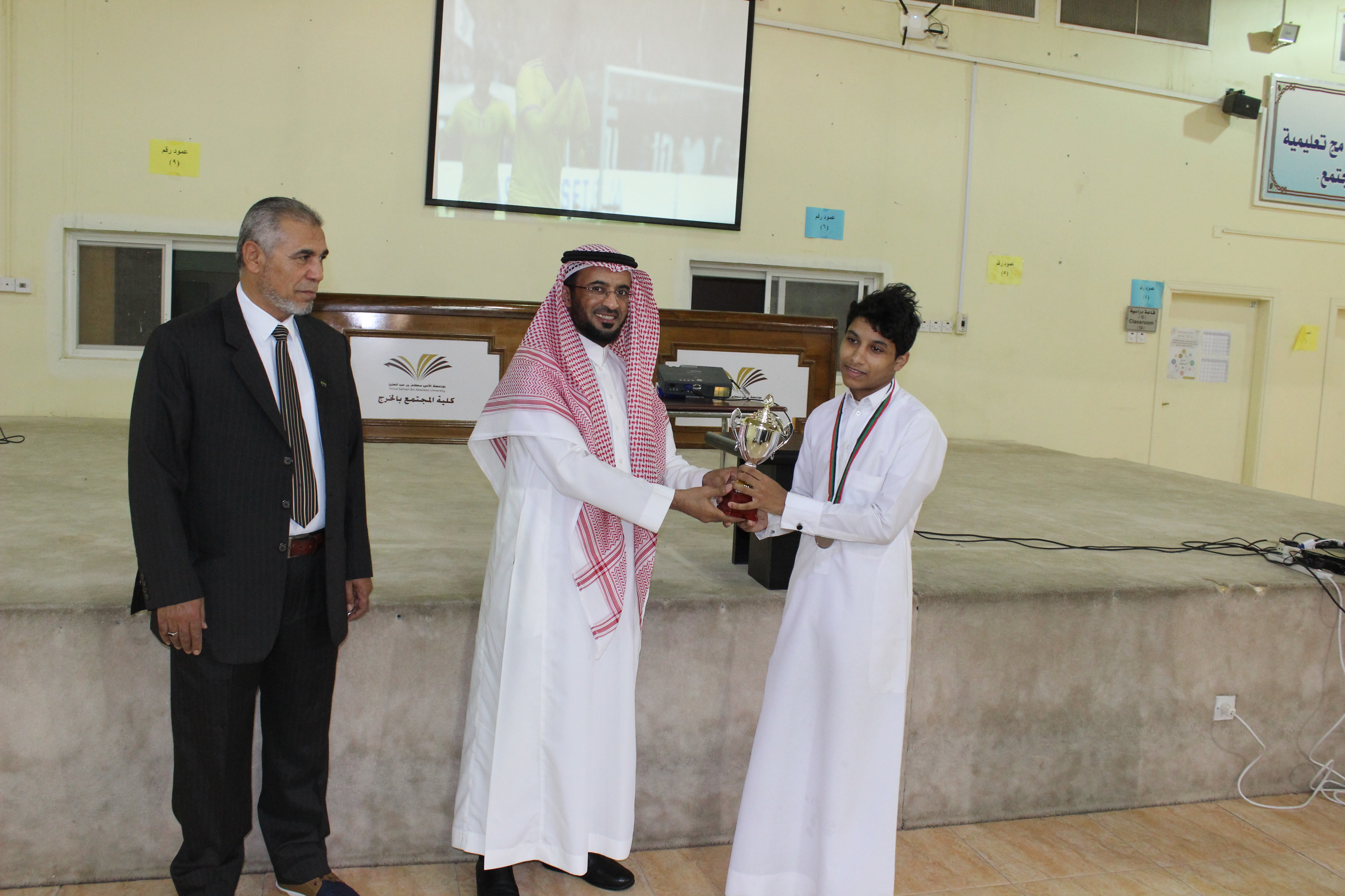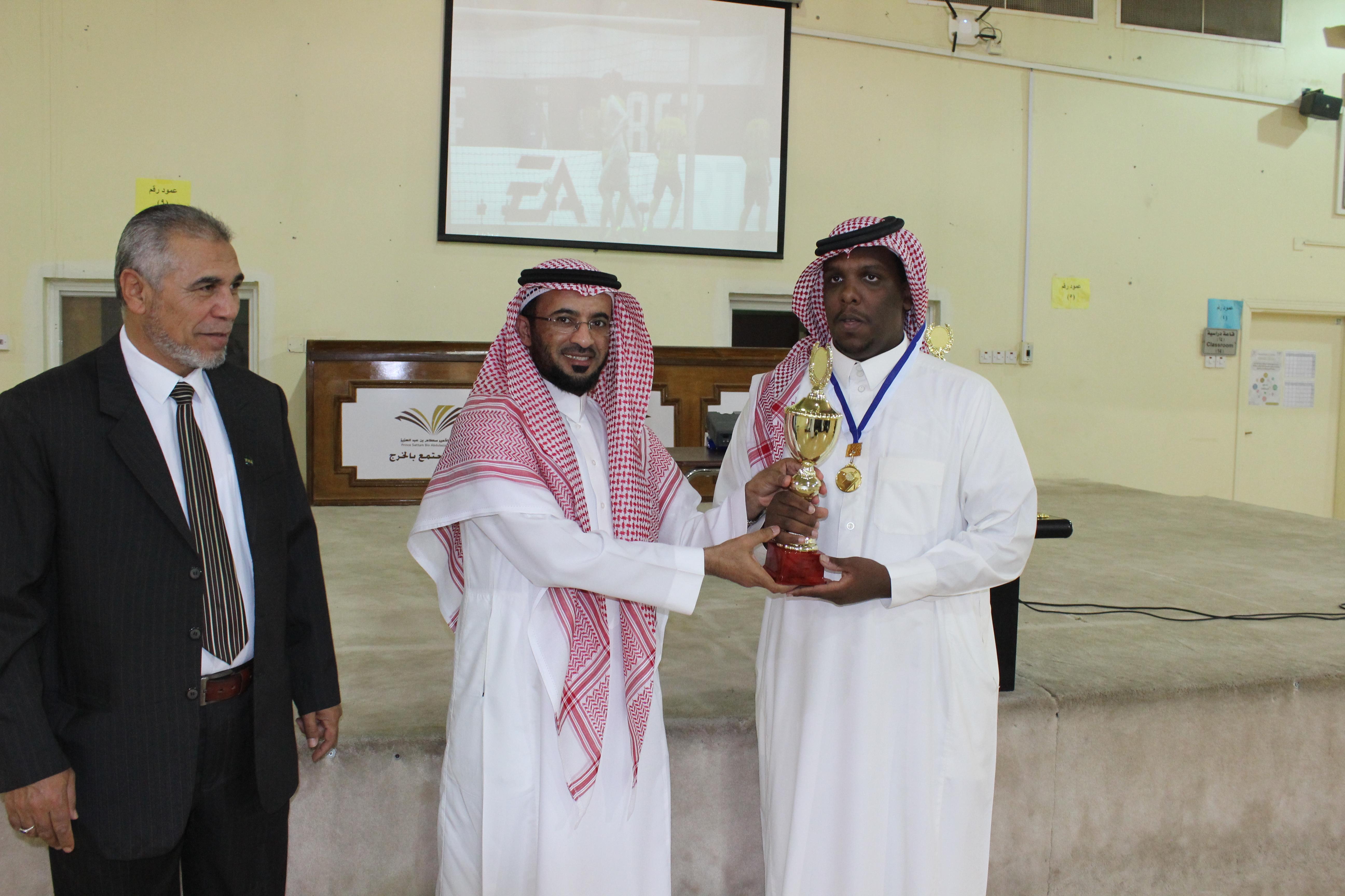 بحضور سعادة عميد كلية المجتمع الدكتور/ حمد بن عبد الله القميزي أقيمت المباراة النهائية في بطولة البلاى سيشن والتي اشترك فيها (40) طالبًا، بين كل من الطالب/ تركي مزيد مفلح العازمي بقسم إدارة الأعمال، والطالب / عبد الله جبران أحمد معيني بقسم اللغة الانجليزية. وانتهت المباراة بفوز الطالب الأول بكأس البطولة، كما أقيمت المباراة النهائية لتنس الطاولة التى اشترك فيها (25) طالبَا، بين كل من الطالب/ مسعود أحمد الغانمي ، والطالب/ فيصل عبد العزيز الخالدي بقسم اللغة الانجليزية وانتهت بفوز الطالب الأول بالكأس، وقد قام سعادة عميد الكلية بتكريم الفائزين وتسليم كأس البطولة لأصحاب المركز الأول. وأكد سعادته على أهمية مشاركة الطلاب في الأنشطة اللاصفية المختلفة لما لها من دور جوهري في بناء شخصيتهم وتنمية مهاراتهم. وقد حضر تسليم الكأس مشرف النشاط الرياضي بعمادة شؤون الطلاب بالجامعة، كما عبر الطلاب عن سعادتهم بهذه البطولة ، وشكروا إدارة الكلية على تنظيم مثل هذه الفعاليات.