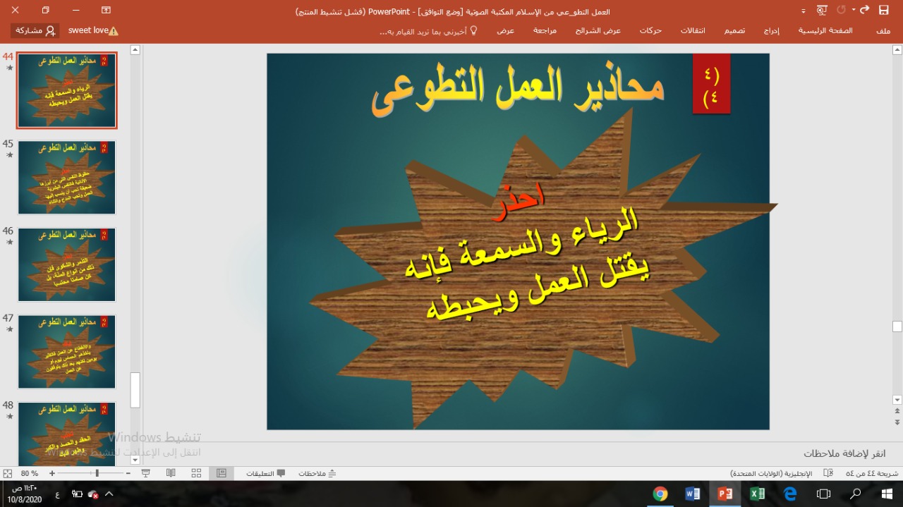 وقد تناولت فيها الدكتورة رفيدة عن العمل التطوعي متناولة أهميته وأهدافه ومجالاته وأثره على الفرد والمجتمع وأهم مجالات العمل التطوعي متناولة أساليب وطرق التطوع وأنواع المتطوعين وما يستفيد منه المتطوع في حياته مقابل تطوعه الذي لا يهدف من خلاله لأي كسب مالي أو معنوي من تنمية ذاتيه والمهارات التي يمتلكها والتي يبقى لها أثر في نفسه والغير.