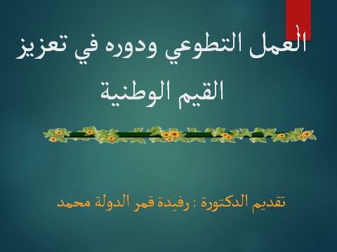 نظمت وحدة العمل الطلابي ممثلة في شعبة العمل التطوعي بإشراف منسقة الكلية للشعبة الدكتورة/ رفيدة قمر الدولة محمد؛ دورة تدريبية عن العمل التطوعي ودوره في تعزيز القيم الوطنية وذلك يوم الخميس الموافق 21-2-1442هـ - عبر برنامج الزوم-