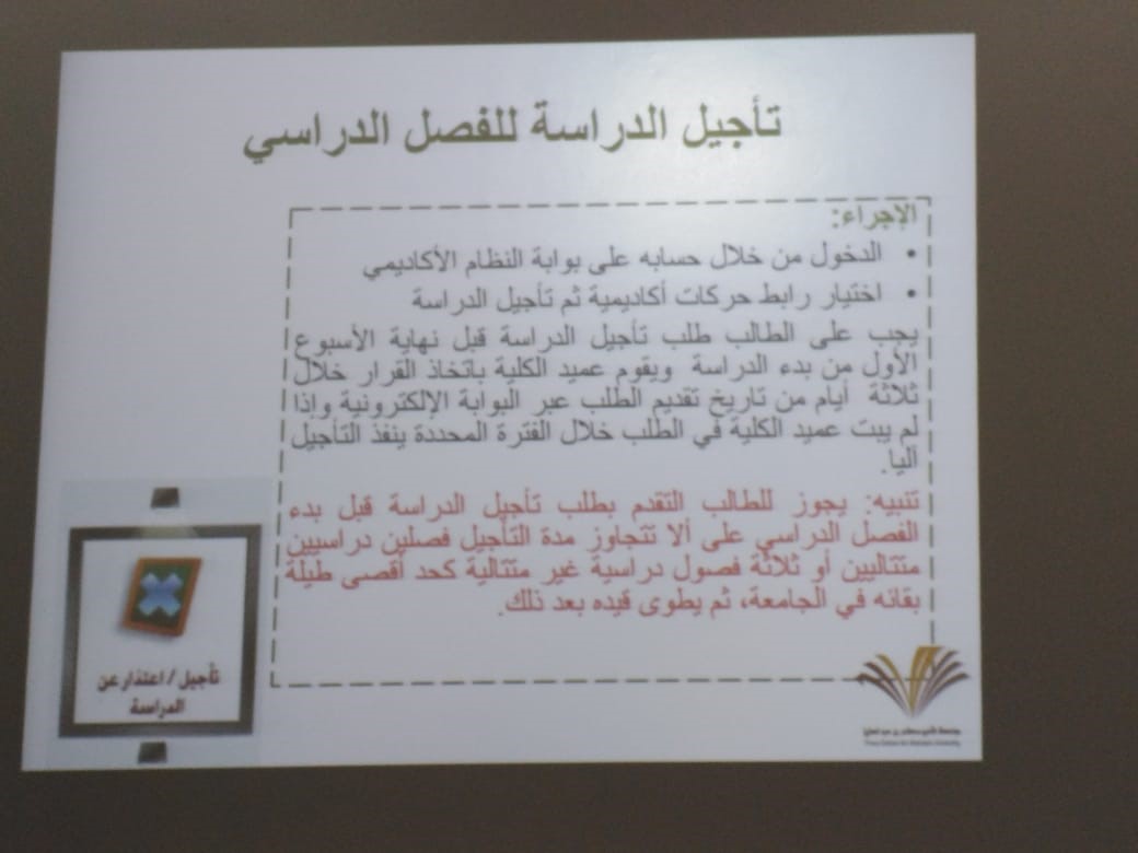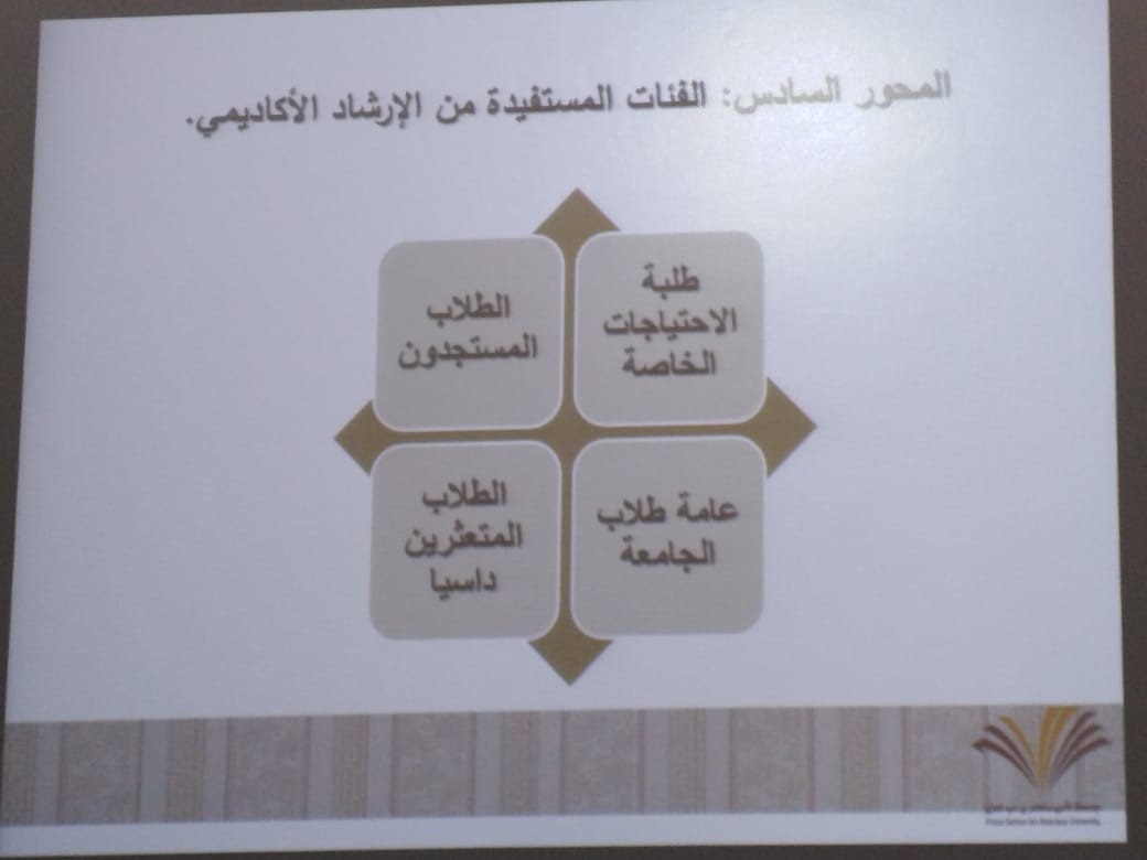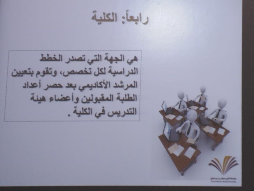 أقامت وحدة الإرشاد الاكاديمي في كلية المجتمع بالخرج بقسم الطالبات وبالتعاون مع وحدة العمل الطلابي ورشه تدريبية، قدمتها الأستاذة / هدى الجليفي من عمادة القبول والتسجيل، وقد أقيمت الورشة على مدار ثلاثة أيام، وكان اليوم الأول للإداريات لتوضيح عدة أمور في إجراءات القبول والتسجيل والحذف والإضافة،واليوم التالي للطالبات للحديث عن الإرشاد الأكاديمي ودور الطالبات في الإرشاد وتوضيح كيفيه حساب المعدل والتفريق بين الاعتذار والتأجيل وكل ما يهم الطالبة في مسار دراستها،وكان اليوم الأخير مخصص لهيئة التدريس والمرشدات الأكاديميات لتوضيح الإرشاد وأهدافه وأهميته للطالبة ودور الأستاذة المرشدة في التقليل من تعثر الطالبات دراسياً.