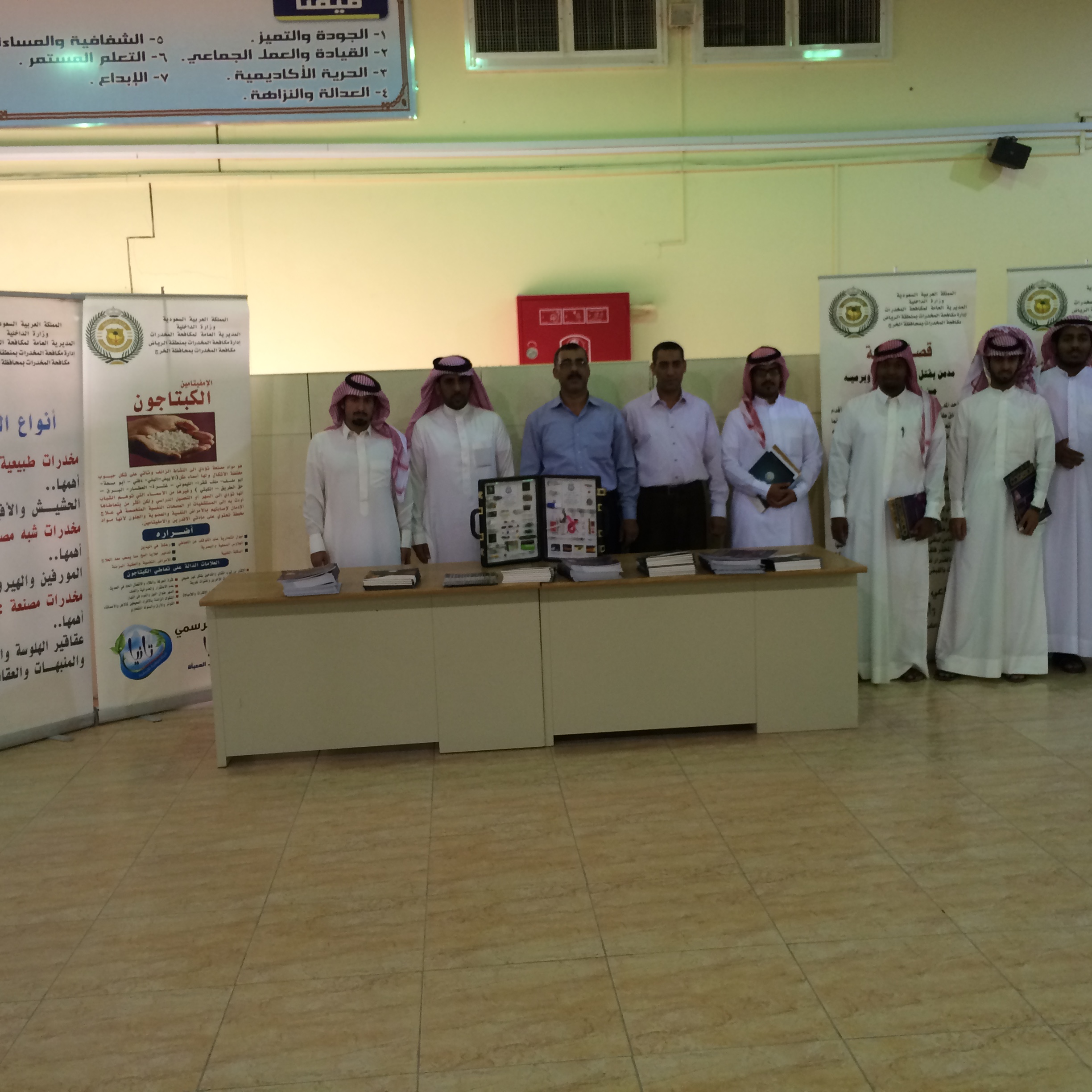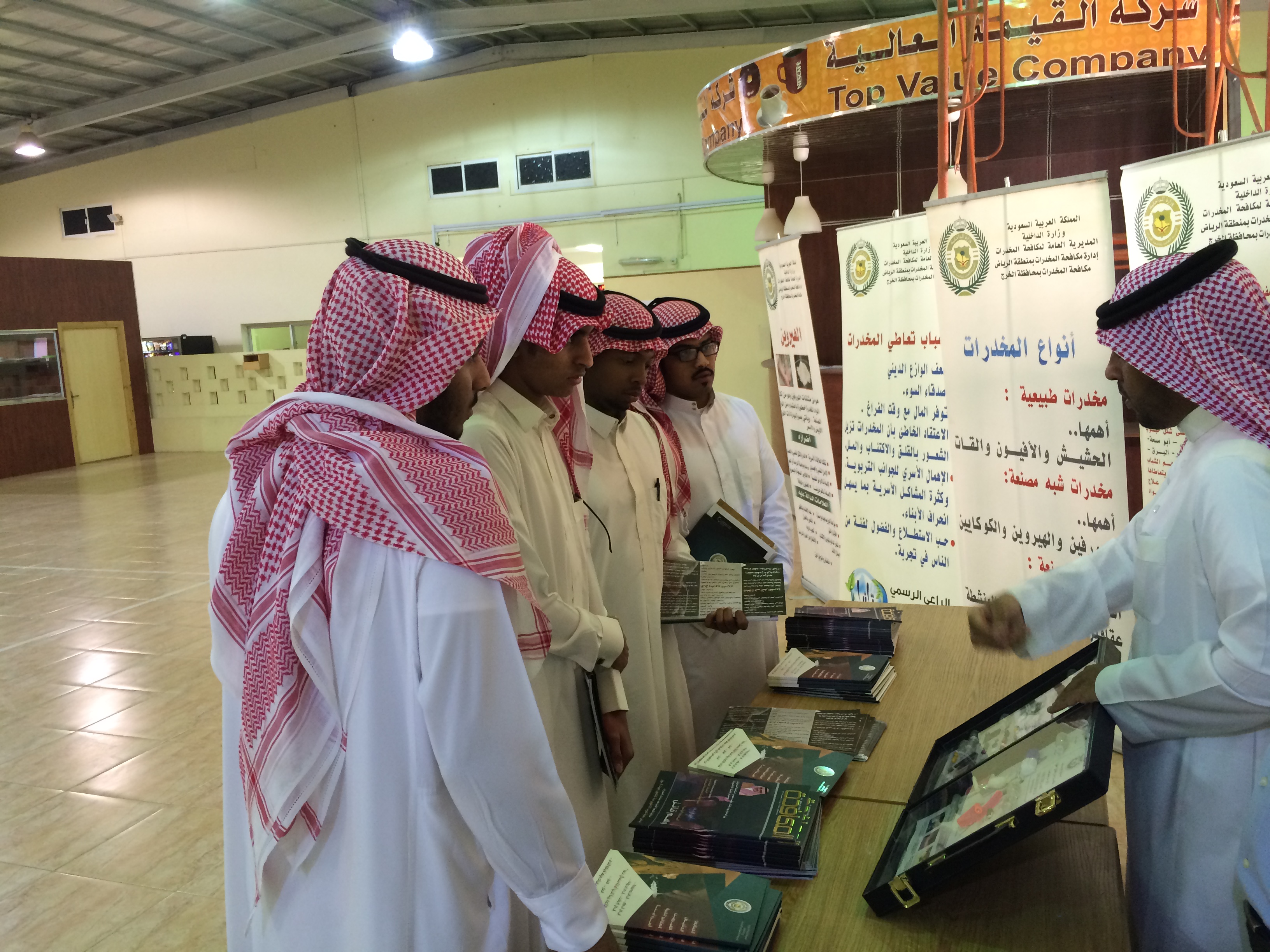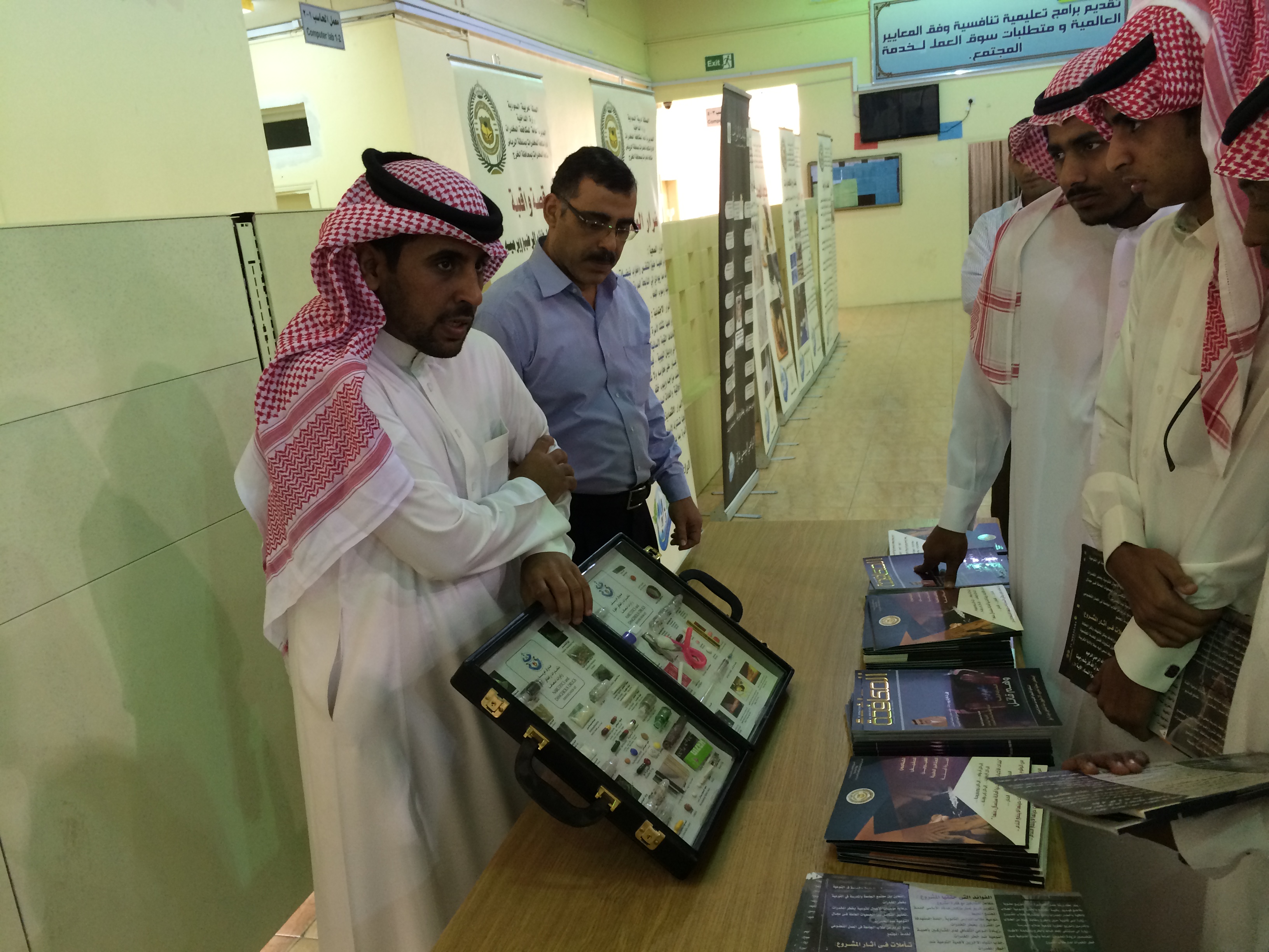 نظمت وحدة النشاط الطلابي بالكلية معرضا توعوىا لمكافحة المخدرات وذلك يوم الأحد الموافق26/4/1436هـ وقد جاء هذا المعرض استجابة لطلب عميد الكلية الدكتور /سعيد بن نزال العنزي بأهمية قيام الكلية بدورها في خدمة المجتمع وقد تضمن المعرض العديد من اللوحات الإرشادية لتعريف الطلاب بالمواد المخدرة وأضرارها على الإنسان والمجتمع, كما صاحب المعرض لقاء مفتوح للطلاب مع أحد العاملين بالإدارة العامة لمكافحة المخدرات بالخرج , الذي قام بعرض صور توضيحية لأشكال المواد المخدرة حتى يتجنبها الطلاب, كما استمع إلى أسئلة واستفسارات الطلاب
