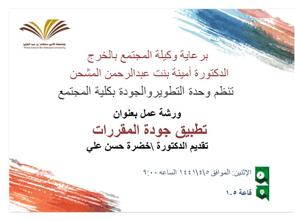 أقامت وحدة التطوير والجودة بكلية المجتمع بالخرج يوم الاثنين الموافق 5-4-1441هـ في قاعة الأنشطة الطلابية بالكلية دورة تدريبية بعنوان " تطبيق جودة المقررات " لعضوات هيئة التدريس بالكلية من تقديم الدكتورة / خضرة حسن علي من قسم إدارة الأعمال في كلية المجتمع .