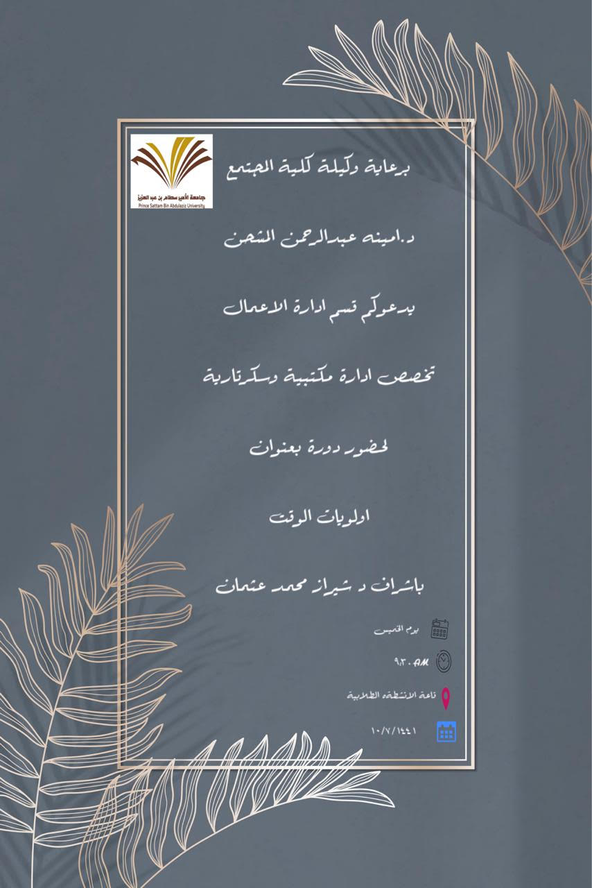 أقام قسم إدارة الأعمال بكلية المجتمع بالخرج تخصص إدارة مكتبية وسكرتارية دورة تدريبية بعنوان " أولويات الوقت " وذلك يوم الخميس الموافق 10/7/1441هـ من تقديم واعداد الدكتورة/ شيراز محمد عثمان؛ مساعدة المشرف على قسم إدارة الأعمال بالكلية وبمشاركة طالبات القسم وقد تناولت الدكتورة شيراز عدد من النقاط والمحاور الهامة كان منها :