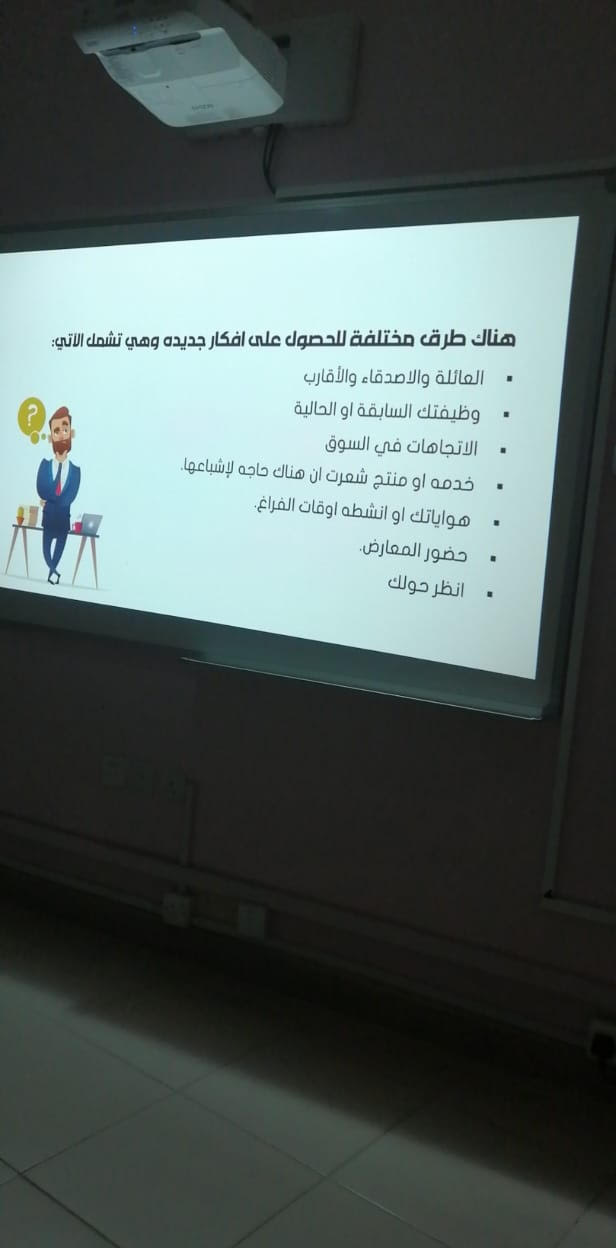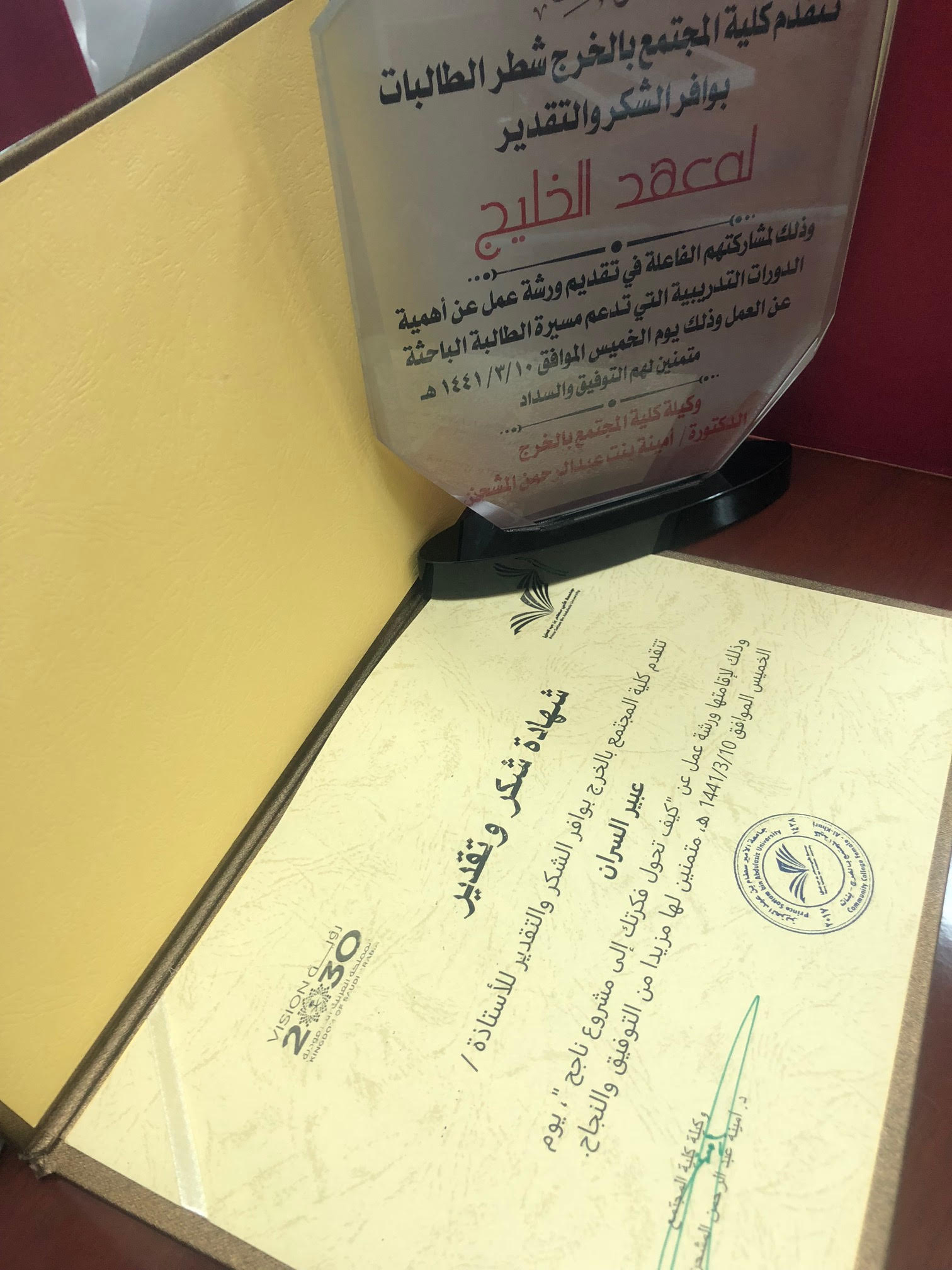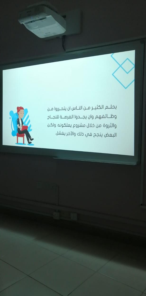 أقامت وحدة التدريب المهني بكلية المجتمع بالخرج و بالتعاون مع وحدة العمل الطلابي و بحضور معهد الخليج للتدريب برنامجاً تدريبياً بعنوان" كيف تحول فكرتك إلى مشروع ناجح"من تقديم الأستاذة/عبير السران؛ وذلك يوم الخميس الموافق ١٠/ ٣/ ١٤٤٢هـ. في قاعة الأنشطة الطلابية بالكلية.