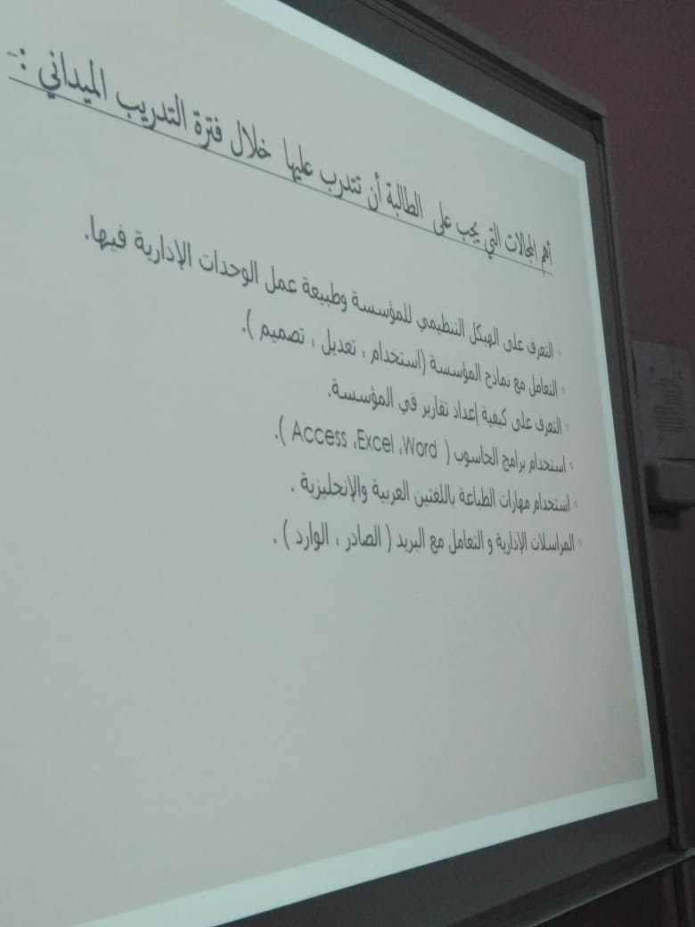 برعاية سعادة وكيلة كلية المجتمع بالخرج الدكتورة/ أمينة بنت عبد الرحمن المشحن؛ وبإشراف الدكتورة/ خضرة حسن علي، وبحضور طالبات ومشرفات التدريب الميداني ومنسوبات الكلية. تم عقد اللقاء التعريفي الأول لطالبات التدريب الميداني يوم الخميس الموافق 20/1/1441هـ حيث ابتدأ اللقاء بكلمة لسعادة وكيلة الكلية الدكتورة/ أمينة بنت عبدالرحمن المشحن. تحدثت فيها عن بعض النقاط الهامة في التدريب الميداني وأكدت على ضرورة التقيد والالتزام بالأخلاق الكريمة التي تعكس الصورة الإيجابية عن المتدربة وعن الكلية والجامعة ثم تلاها كلمة الدكتورة/ خضرة حسن، تطرقت فيها إلى موضوع خطة التدريب الميداني ومخرجاته موضحة للطالبات كيفية التعامل وانجاز الأعمال داخل مؤسسة التدريب وكيفية إعداد التقرير اللازم عن التدريب استعداداً لمناقشته بشكل جيد. كما قدمت مجموعة من النصائح للطالبات عن الالتزام بالحضور والانصراف والانضباط في العمل مع الحفاظ على سريته. وفي ختام البرنامج تقدمت سعادة وكيلة الكلية بالشكر والتقدير لسعادة عميد الكلية الدكتور حمد بن عبدالله القميزي على دعمه المستمر للطالبات؛ وخصوصاً طالبات التدريب الميداني؛ كما قدمت شكرها لمشرفات وحدة التدريب الميداني في الكلية على جهودهن المبذولة وتمنت لهم مزيد من التفوق والنجاح .