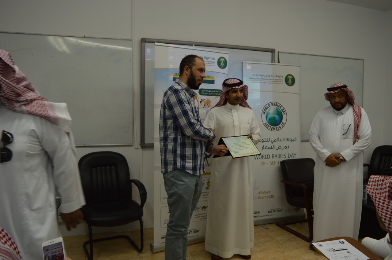 ومن جانبه أشار د. أحمد فتحي إلى التعريف باليوم العالمي للسعار،وبعض الحقائق الرئيسية عن المرض، وخصائص الفيروس ،كما تناول مصادر الإصابة ، وأعراض المرض عند الحيوانات ، والاجراءات المتبعة في تشخيص المرض، وكذلك الاجراءات المبتعة عند الاشتباه بإصابة الحيوانات بمرض السعار ،كما أكد د. فتحي على أهمية الوقاية من مرض السعار من خلال تطعيم الحيوانات المستأنسة، وعدم لمس الحيوانات البرية أو الضالة،وضرورة أخذ المصل عند تعرض الشخص للإصابة