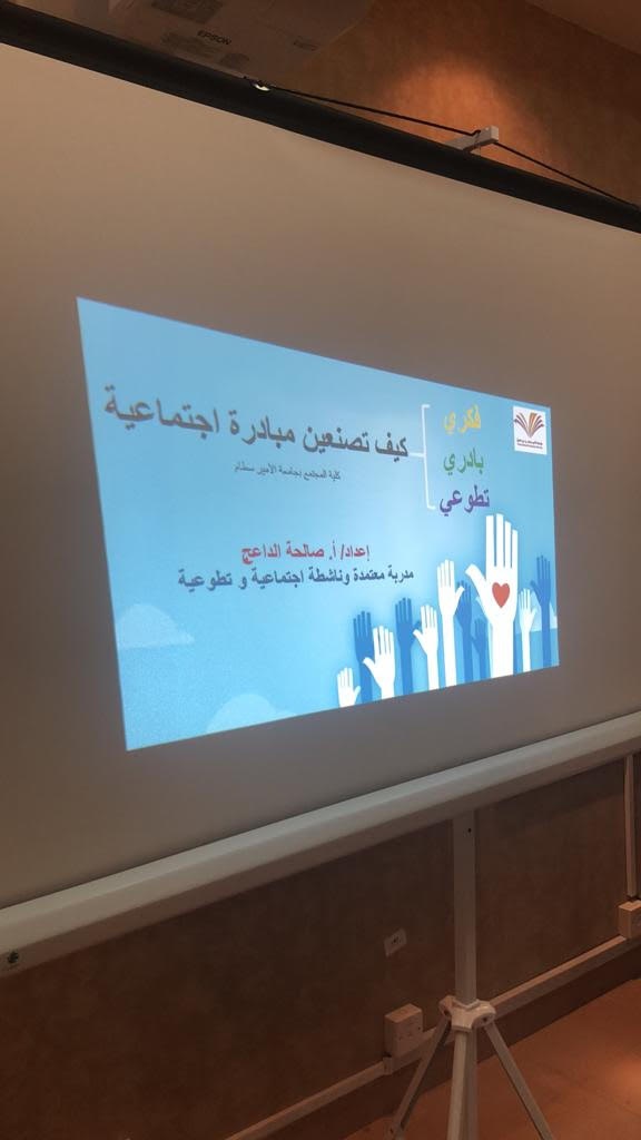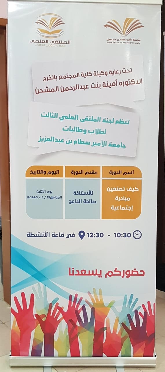 استمراراً في تحضير طالبات كلية المجتمع للملتقى العلمي الثالث ومن أجل تحفيزهم على المشاركة في محور المبادرات التطوعية تم تقديم ورشه عمل بالتعاون مع المجلس الطلابي يوم الاثنين 15/5/1440هـ، بعنوان "كيف تصنعين مبادرة تطوعية" تقديم الأستاذة والمدربة المعتمدة/ صالحة الداعج.