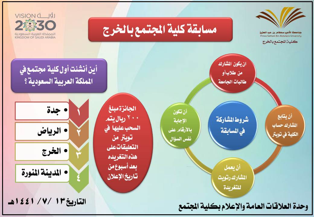 ومن الجدير ذكره أن مسابقة كلية المجتمع بالخرج الإلكترونية سوف تنطلق يوم الأحد الموافق 13/7/1441هـ وهي مسابقة تحوي أسئلة ثقافية متنوعة تتمحور حول الحياة الجامعية ويمكن المشاركة فيها عبر حساب الكلية في تويتر وسوف يكون السحب على الجائزة بعد أسبوع من تاريخ انطلاقها والمشاركة فيها متاحه لجميع طلاب وطالبات جامعة الأمير سطام بن عبدالعزيز .