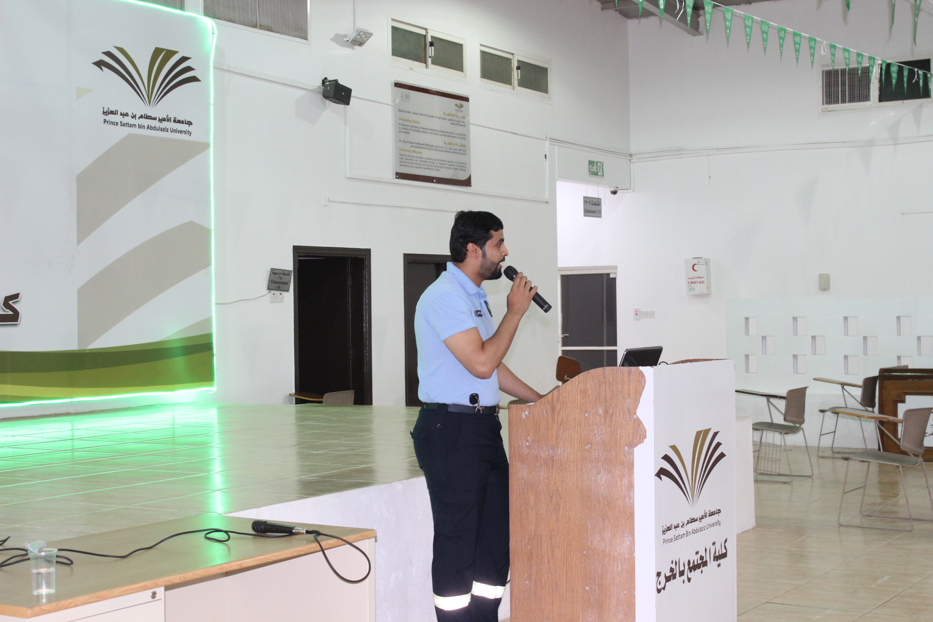 تحت رعاية سعادة عميد كلية المجتمع بالخرج وفي إطار حرص الكلية على تحقيق مخرجات برنامج الأمن والسلامة المهنية وانطلاقاً من تعزيز الشراكات المجتمعية التي تربط الكلية بشركائها ، نظّم نادي ريادة الأعمال بالتعاون مع الدفاع المدني بالخرج ورشة عمل تحت عنوان "أساسيات الأمن والسلامة المهنية والوقاية ضد الحرائق والمواد الخطرة" قدمها سعادة الرقيب المدرب / هليل بن عبد الله الحربي وذلك مساء يوم الأربعاء 25/02/1441 هــ. وتطرق سعادة الرقيب إلى عدة محاور أساسية تتعلق بأهمية الأمن والسلامة المهنية في المنشآت الحكومية والخاصة ودورها في الحفاظ على الممتلكات وتحسين أداء منظمات العمل. كما تمحور اللقاء حول الأنظمة العالمية والمعتمدة بالمملكة والمتعلقة بالسلامة المهنية. وتابع الرقيب / هليل الحربي اللقاء بمناقشة وشرح التصنيفات العالمية للمواد الخطرة وأنواع الحرائق وكيفية مكافحتها والوقاية ضدها لتجنب الأضرار الجسيمة التي قد تنجر عنها. وتم اختتام ورشة العمل بالرد على جميع استفسارات طلاب برنامج الأمن والسلامة المهنية. وأكد سعادة عميد كلية المجتمع بالخرج الدكتور / حمد بن عبد الله القميزي أن هذه الورشة تعدّ حلقة من سلسلة محاضرات ولقاءات أخرى ستقدمها الكلية لطلاب البرنامج مثل استراتيجيات وآليات الإخلاء ودورة في الإسعافات الأولية وذلك بالتعاون مع إدارة الدفاع المدني وإدارة الهلال الأحمر.