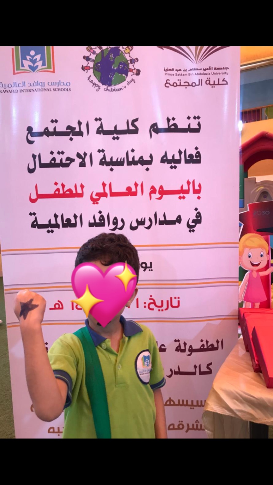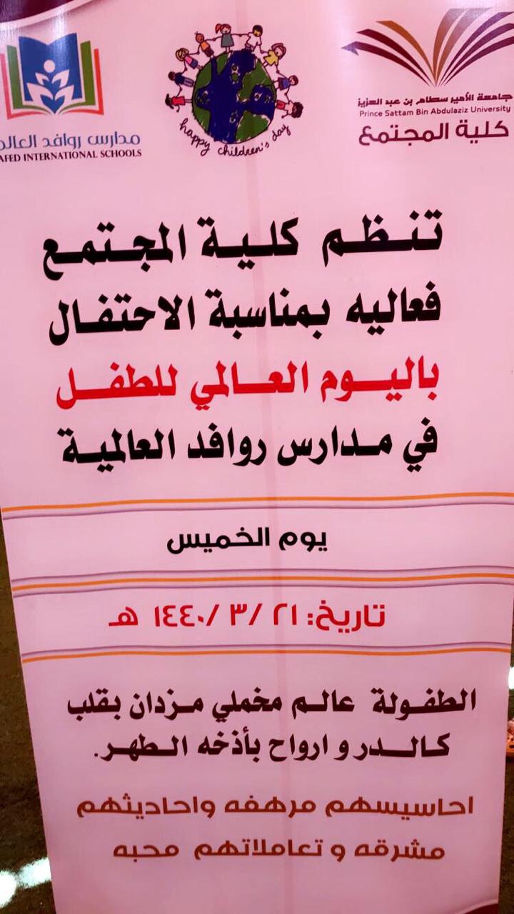 في صباح يوم مشرق جميل كإشراق وجوه الأطفال وروعة براءتهم، نظم المجلس الطلابي بكليه المجتمع يوم الخميس الموافق١٤٤٠/٣/٢١هـ زيارة لمدرسة روافد العالمية للاحتفال بفعالية " يوم الطفل العالمي" حيث تم افتتاح الفعالية ببرامج متنوعه للأطفال و تضمنت الفعالية أركاناً ترفيهيةً ومسابقات تفاعلية ورسم على وجوه الأطفال من إعداد طالبات كلية المجتمع