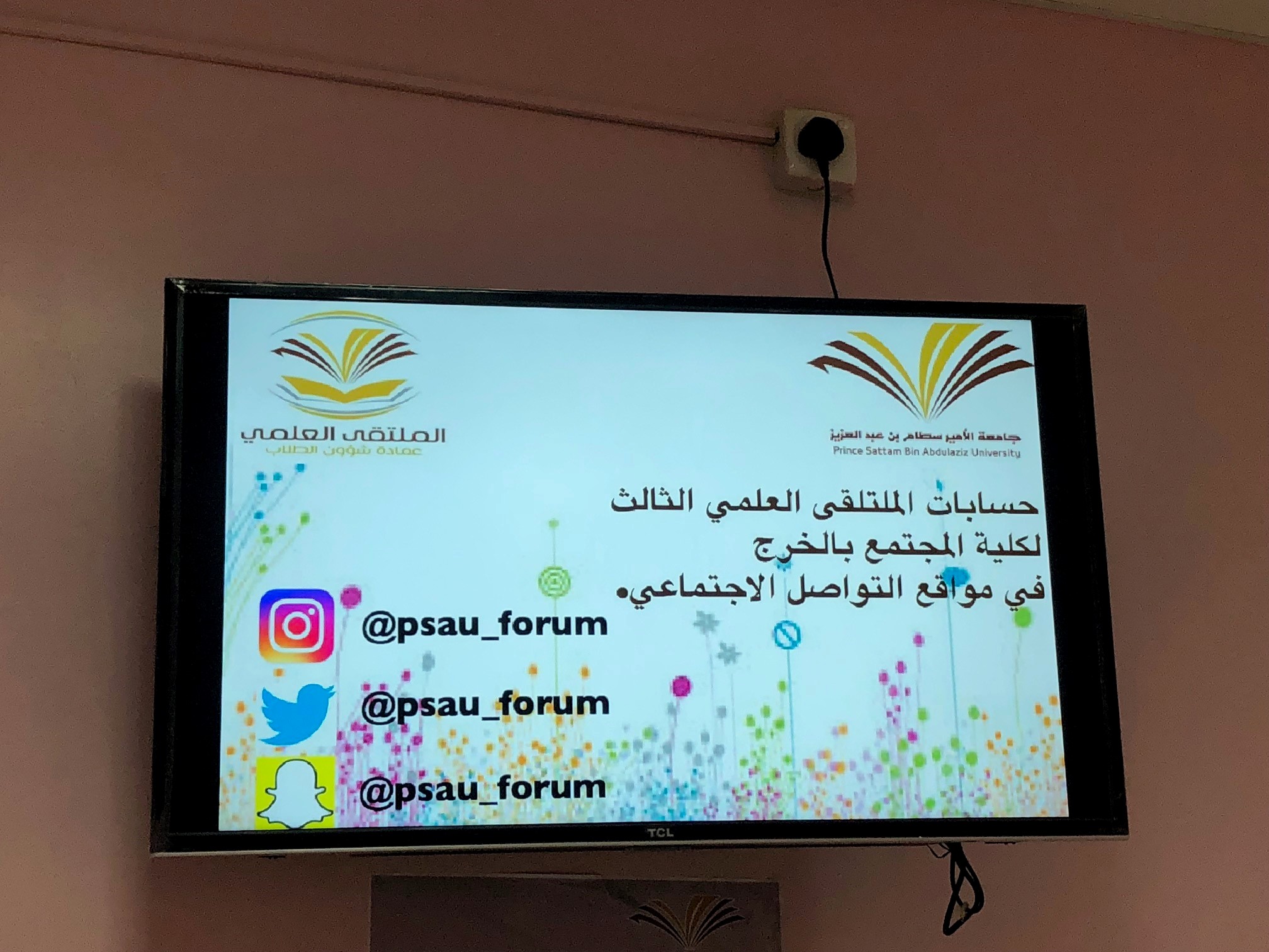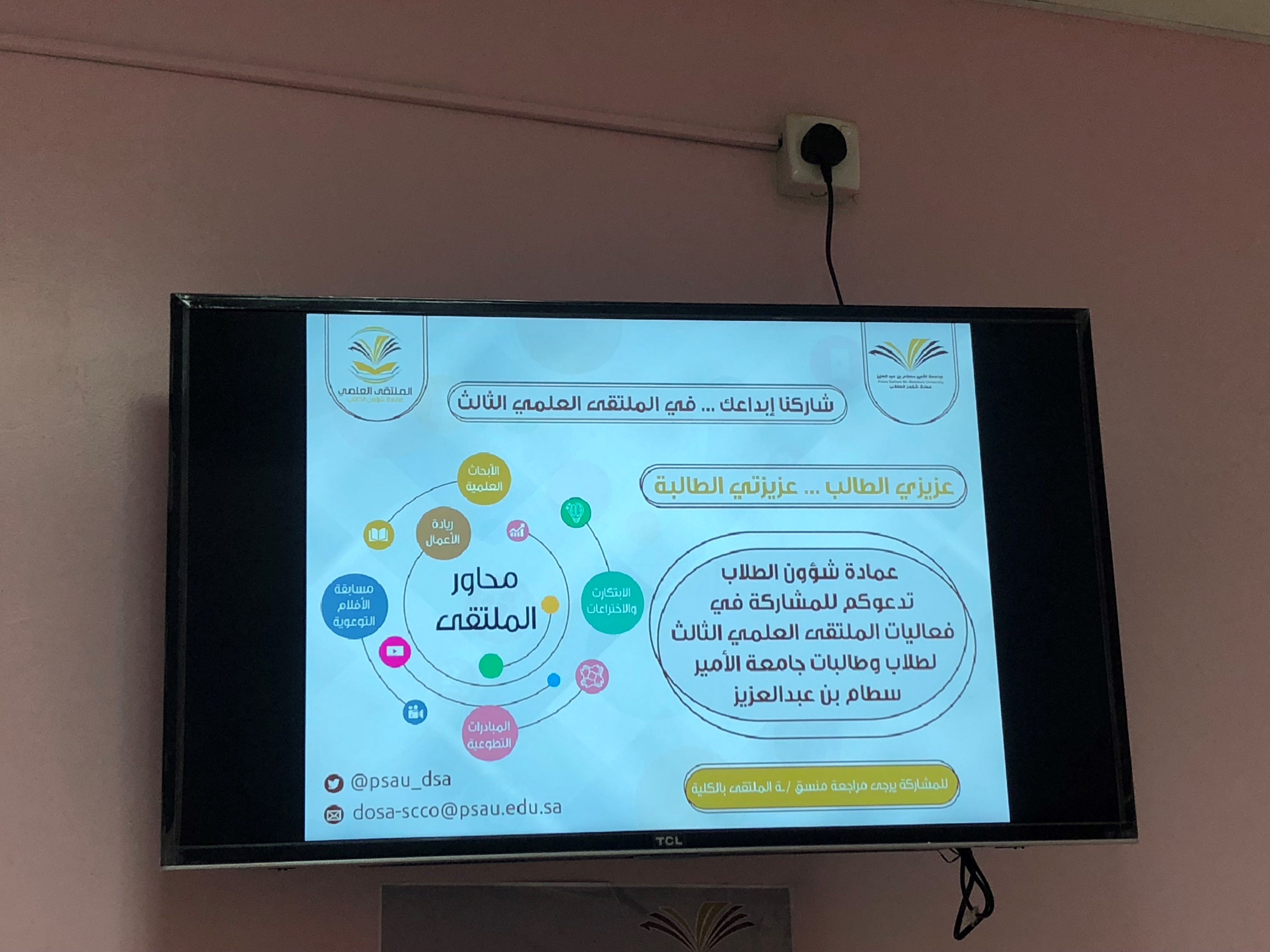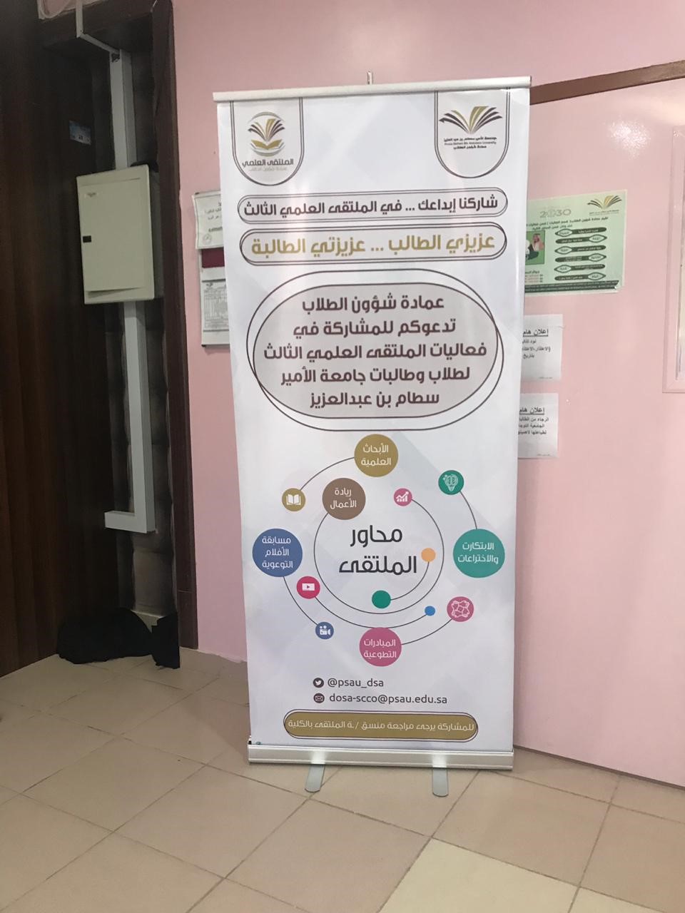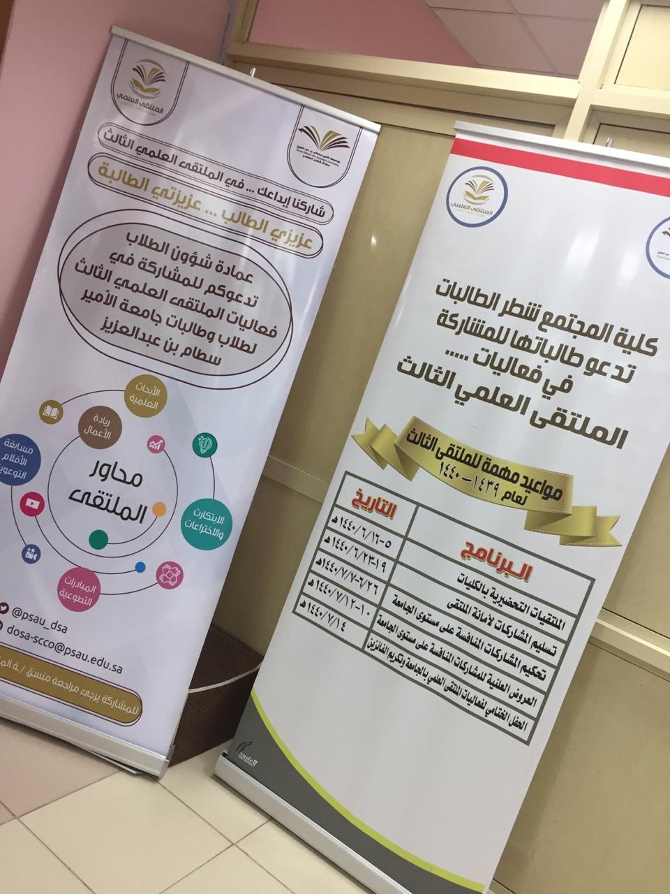 تحت رعاية سعادة وكيلة كلية المجتمع الدكتورة / أمينه بنت عبدالرحمن المشحن . وبإشراف منسقة الملتقى العلمي الثالث بالكلية الأستاذة/ سناء أحمد عزام .أطلقت الكلية حملة الدعاية والإعلان للملتقى العلمي الثالث وذلك لهدف التعريف بالملتقى وحث الطالبات على المشاركة فيه .وكان ذلك باستخدام كافة الوسائل التقنية من وسائل التواصل الاجتماعي والشاشات الداخلية والمطبوعات الورقية والبنرات التي تم وضعها في مداخل الكلية وأيضا من خلال رفع الضوابط والشروط لمحاور الملتقى والمواعيد الهامه للطالبات على نظام البلاك بورد كما ساهم المجلس الطلابي بشكل فعّال في نشر الإعلانات بين الطالبات وحثهن على المشاركة في الملتقى .