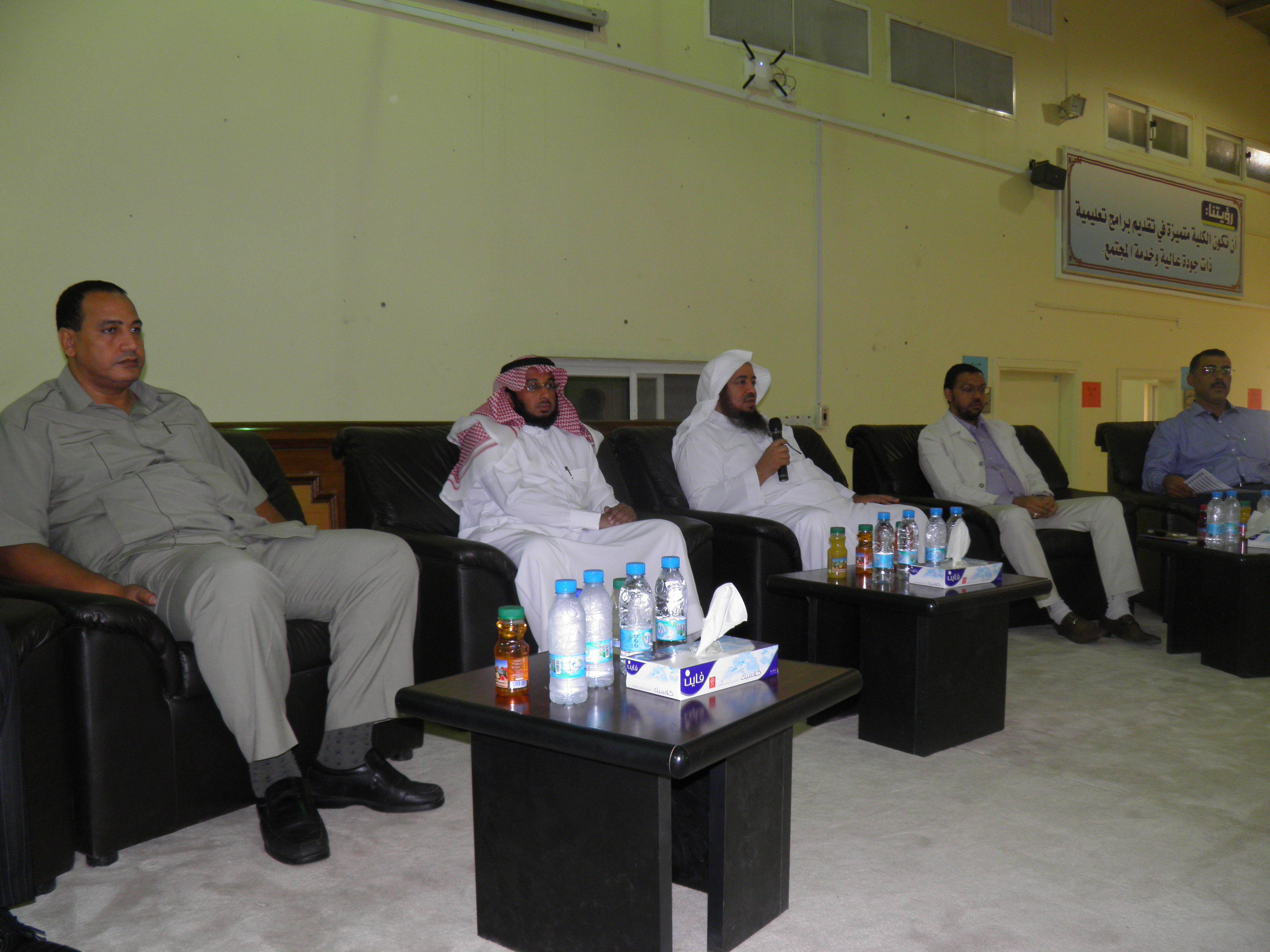 بدأ اللقاء بكلمة لعميد الكلية رحب في بدايتها بالطلاب وشكرهم على حضورهم، ثم قدم فيها تعريفاً مختصراً بأقسام الكلية الإدارية والأكاديمية، ثم أعطى نبذه عن تخصصات الكلية والدرجة التي تمنحها الأقسام.