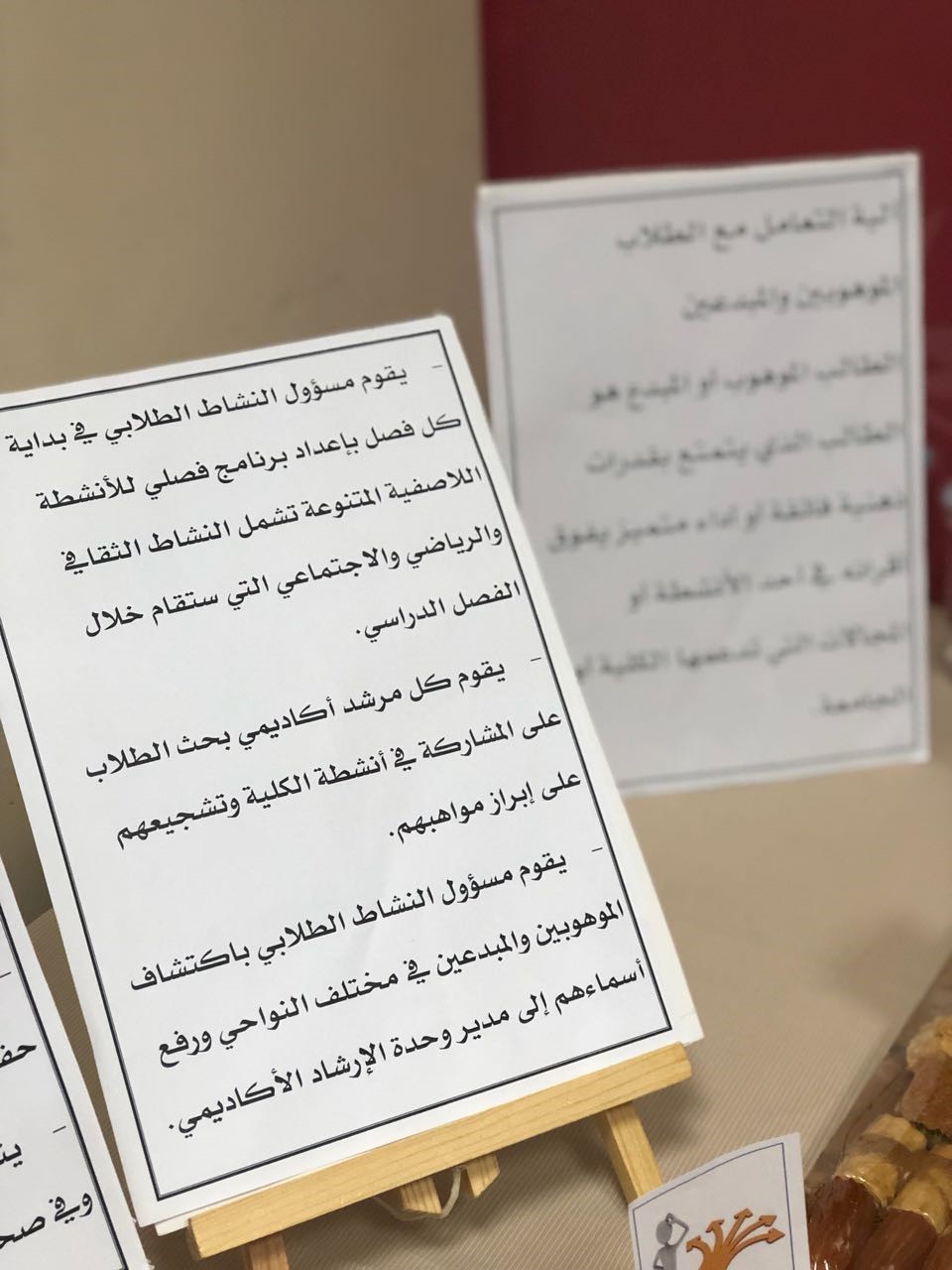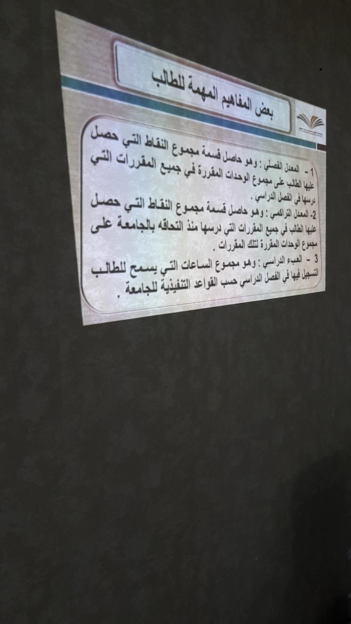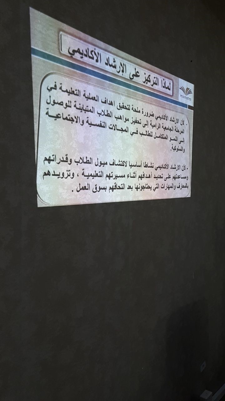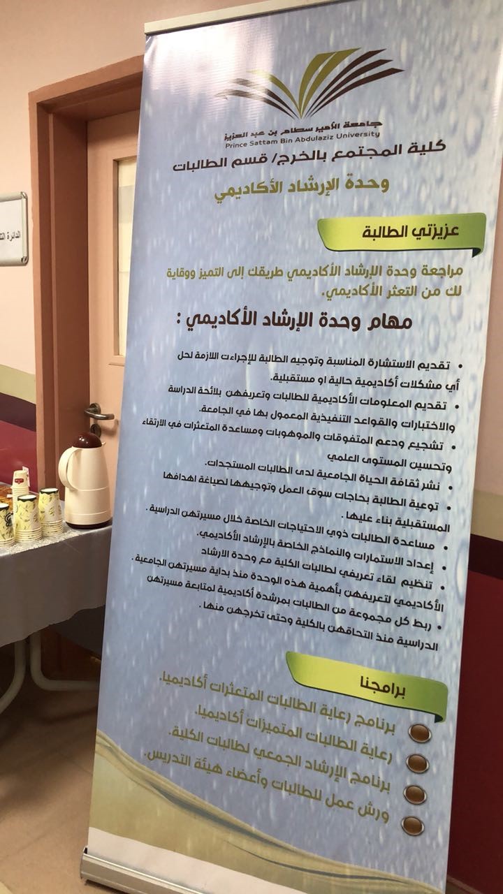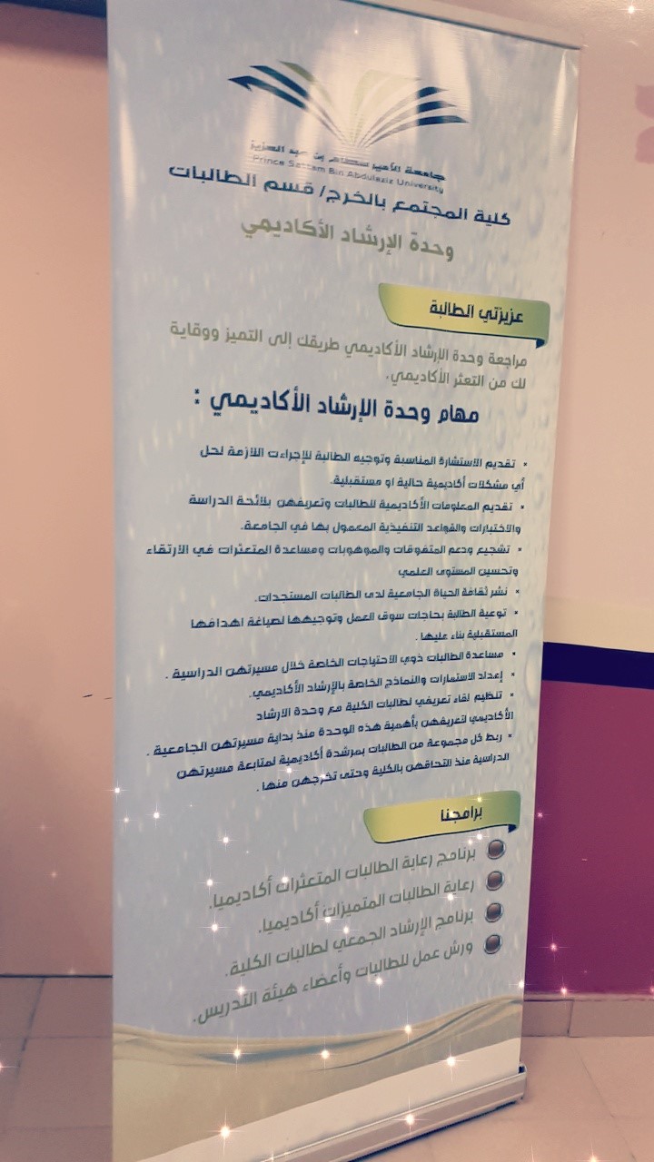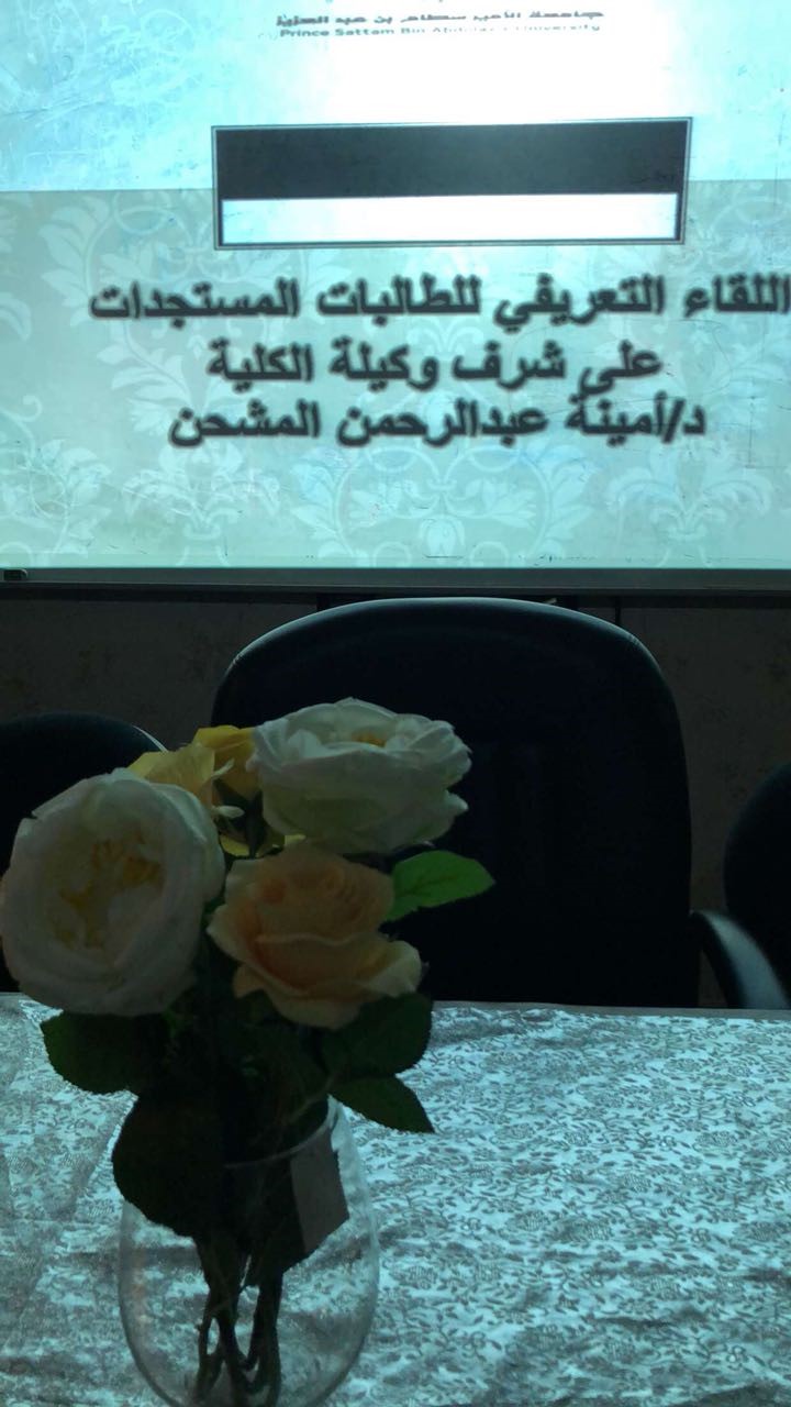 تحت رعاية سعادة وكيلة الكلية الدكتورة / أمينة عبد الرحمن المشحن. أقامت الكلية خلال الفترة من 11-15/5/1439هـ الأسبوع التعريفي للطالبات المستجدات حيث نظمت وحدة العمل الطلابي بالتعاون مع وحدة الإرشاد الأكاديمي استضافة للدكتورة / أديل سليمان وهيبي من الوحدة الإشرافية لكليات البنات يوم الأثنين الموافق 12/5/1439هـ لعقد ورشة عمل عن الإرشاد الأكاديمي وذلك لتهيئة الطالبات المستجدات وتعريفهن بحقوقهن وواجباتهن بما يسهم في رفع مستوى الوعي لديهن كما تم عمل ركن تعريفي للطالبات المستجدات في الكلية لتوعية الطالبات وتثقيفهن أكاديميًا وعلميًا. كما تم في يوم الخميس الموافق 15/5/1439هـ عقد لقاء تعريفي للطالبات المستجدات بحضور وكيلة الكلية ووكيلات الأقسام في الكلية حيث بدأ اللقاء بآيات من القران الكريم ثم تلاها كلمة لوكيلة الكلية الدكتورة /أمينة عبد الرحمن المشحن. رحبت فيها بالطالبات المستجدات وحثتهن على بذل الجهد لتحقيق النجاح والتفوق بإذن الله وتمنت لهن التوفيق والسداد في مسيرتهن العلمية ثم تلاها كلمة الأخصائية الاجتماعية في الكلية الأستاذة / أفنان فهد الرفاعي حيث وضحت لهن دور الأخصائية الاجتماعية وأن الطالبة مرحب بها في أي وقت لمساعدتها في حل أي قضية أو مشكلة تواجهها من الناحية الصحية والاجتماعية والسلوكية ثم تلاها كلمة وكيلة قسم الحاسب الآلي الأستاذة / ناهد أبو زيد وضحت فيها بعض النقاط الهامة التي تخص الطالبات منها الحضور والغياب وسياسة التحويل وغيرها.