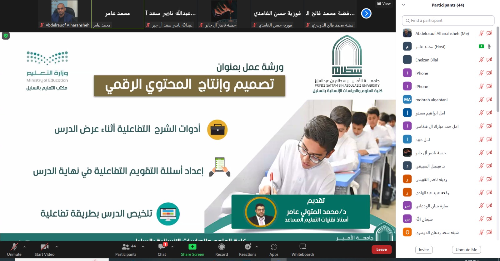 نفذت كلية العلوم والدراسات الإنسانية في محافظة السليل في يوم الإثنين الموافق 22/ 7 /1444 هـ عبر تطبيق زووم برنامجا تدريبيا بعنوان "تصميم وإنتاج المحتوى الرقمي". يأتي هذا البرنامج ضمن حزمة البرامج التي تقدمها الكلية بالتشارك مع مكتب تعليم محافظة السليل. قدم هذه الدورة الدكتور محمد المتولي عامر من قسم الحاسب الآلي في الكلية حيث تضمنت الدورة تعريفا شاملا التصميم وإنتاج المحتوى الرقمي وكيفية استخدامها في التعليم، وكما تطرق المدرب الى اهداف عملية دمج تصميم المحتوى الرقمي في التعليم وما هي المهارات الرئيسية لتصميم المحتوى الرقمي للمقررات، وكما تطرق المدرب الى أهمية استخدام التكنولوجيا في تحقيق رؤية المملكة 2023من خلال التدريب والتطوير. حضر الدورة 80 معلم ومعلمة من المحافظة وعبروا عن شكرهم لإدارة الكلية لتقديم مثل هذه البرامج النافعة والتي تأتي تحقيقا لرؤية واهداف الكلية في خدمة المجتمع وتقديم أفضل الخدمات التدريبية والاستشارية. واختتمت الدورة بإعطاء الفرصة للمشاركين في البرنامج في طرح الاستفسارات والتي اجاب عنها الدكتور محمد المتولي متمنيا للحضور التوفيق والسداد.