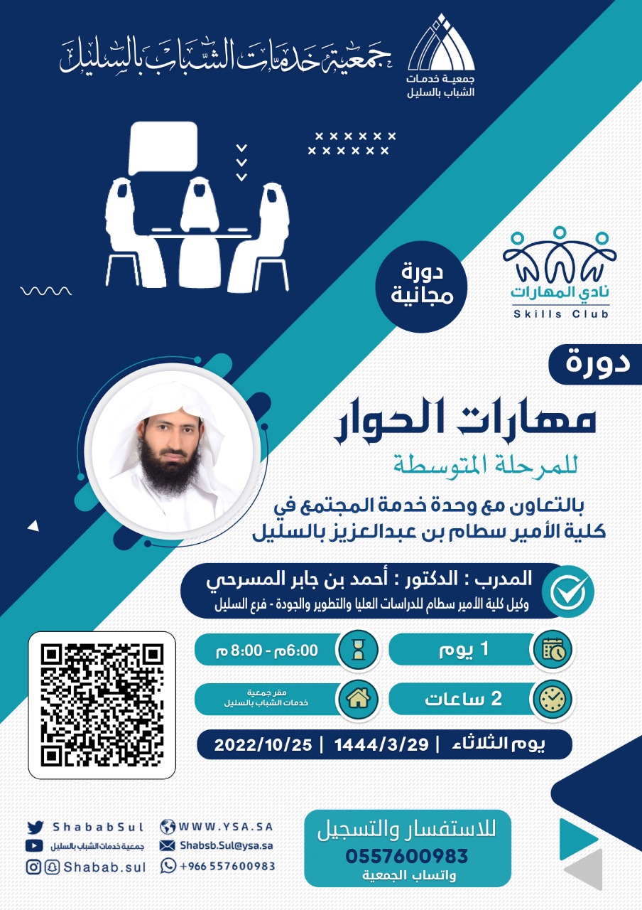 أقامت وحدة خدمة المجتمع بكلية العلوم والدراسات الإنسانية بالسليل بعقد دورة تدريبية بعنوان مهارات الحوار وذلك يوم الثلاثاء بتاريخ29/3/1444 الموافق25/10/2022 في مقر جمعية شباب محافظة السليل، وكانت موجهه لطلاب المرحلة المتوسطة في المحافظة .