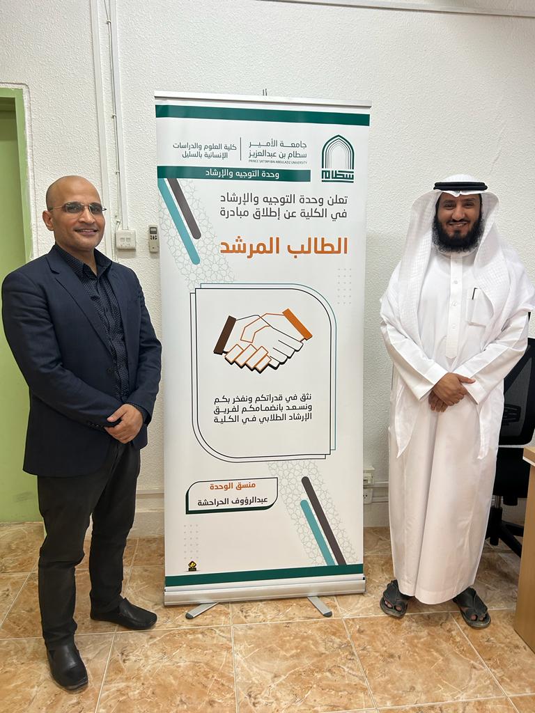 تحت رعاية عميد الكلية الدكتور فيصل السبيعي، أطلقت وحدة التوجيه والإرشاد في كلية العلوم والدراسات الإنسانية بالسليل مبادرة (الطالب المرشد)، وذلك يوم الأربعاء 11/10/2023م.