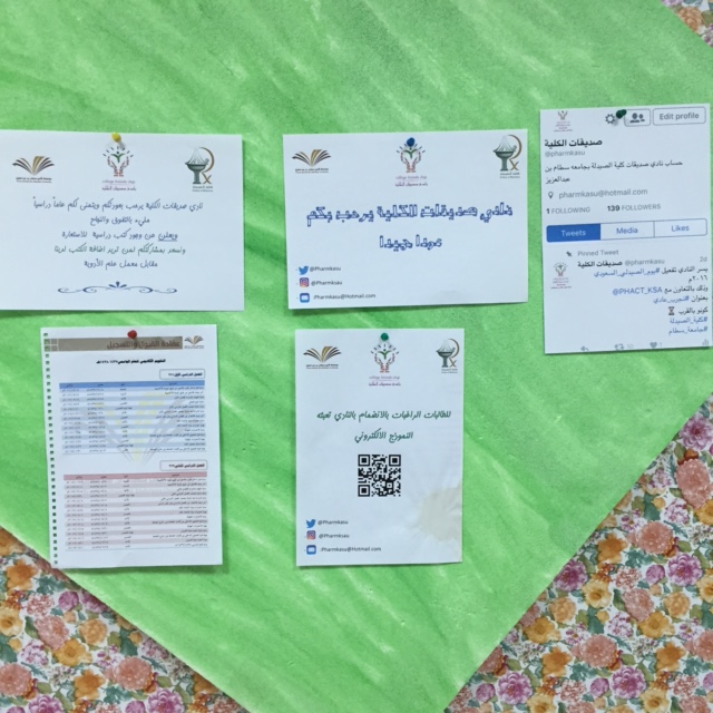 دشنت كلية الصيدلة أقسام الطالبات البرنامج الإرشادي للطالبات المستجدات في الكلية وذلك بداية من يوم الأحد الموافق 17\12\1437ه والذي يستمر لمدة أسبوع كامل حيث تم عمل أركان في ممرات الكلية من إعداد طالبات الكلية احتوت على منشورات تثقيفية وعبارات تشجيعية تحمس الطالبات لبذل الجهد في الجد والمثابرة في طلب العلم وتم يوم الاثنين الموافق 18\12 اجتماع مساعدة عميد الكلية لشطر الطالبات أ.د.أماني عواد في لقاء تعريفي مع الطالبات المستجدات حيث رحبت بالطالبات وبينت لهن فضل وأهمية الإخلاص في طلب العلم و شرحت لهن الأنظمة المتبعة في الكلية والبرنامج الاكاديمي المتبع وآلية الدراسة وطريقة الاختبارات بالإضافة الى الخدمات التي تقدمها الكلية للطالبة ،ثم تلى ذلك الحديث عن المجلس الطلابي في الكلية والدور المهم الذي يساعد به الطالبة لتسهيل العملية التعليمية بالكلية بالإضافة إلى الحديث عن أهمية الأنشطة الطلابية والفائدة التي تعود على الطالبة مبينة أن الكلية تضم ٦ نوادي وهي نادي القراءة ونادي البحث العلمي ونادي صديقات الكلية ونادي الفنون والابداع ونادي مشكاة نور حيث قامت رئيسة كل نادي من الطالبات بالحديث عن النادي وأهدافه وآلية المشاركة فيه وفي يوم الثلاثاء تم عمل جولة تعريفية على جميع أقسام الكلية والمعامل والتحدث مع أعضاء الهيئة التدريسية عن المقررات وآلية الاختبارات وفي نهاية الجولة تم الإجابة عن جميع استفسارات الطالبات