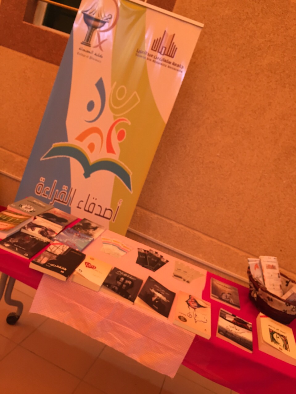 تزامنًا مع معرض الرياض الدولي للكتاب الذي تشهده العاصمة الرياض حاليا قام مجموعة من طالبات كلية الصيدلة ضمن النشاط الطلابي في الكلية بعمل ركن مميز بعنوان أصدقاء القراءة وذلك يوم الخميس الموافق 14\5\1436ه ، حيت تم عرض مجموعة من الكتب المفيدة بغرض نشر ثقافة القراءة والكتب بين الطالبات لتغذية التكوين الفكري والبناء الثقافي المعرفي لهن حيث إن القراءة هي إحدى الوسائل المهمة لاكتساب العلوم المختلفة، والاستفادة من منجزات المتقدمين والمتأخرين وخبراتهم إذ التلفاز والمذياع وما يشابههما لا يستطيعان بناء الثقافة المتنوعة الهادفة لطالب العلم الجاد, ولكنهما يشاركان الكتاب في ذلك .