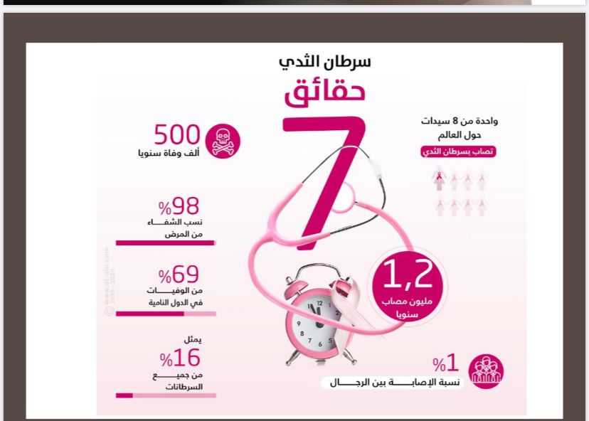 في بداية المحاضره تم توضيح ما هو سرطان الثدي؟ بطريقه مفصله وعلميه فسرطان الثدي Breast Cancer هو مرض يصيب النساء بالتحديد، لكنه قد يصيب الرجال أيضاً وإن كان بنسبة أقل بكثير و سرطان الثدي يعني أن عدداً من خلايا الثدي بدأت تتكاثر بشكل غيرطبيعي نتيجة طفرات جينية، وهذه الخلايا تنقسم بسرعة أكبر من الخلايا السليمة ويمكن أن تبدأ في الانتشار في جميع أنحاء نسيج الثدي إلى داخل الغدد الليمفاوية وإلى أعضاء أخرى في الجسم.