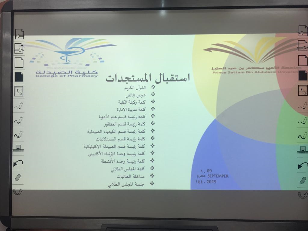 تحت رعاية سعادة وكيلة كلية الصيدلة قسم الطالبات بالخرج الدكتورة/ حنان بنت عبدالله البلوي أقامت وحدة الأرشاد الأكاديمي برئاسة الدكتورة/ منال العصيمي وبمشاركة المجلس الطلابي اللقاء التعريفي للطالبات المستجدات وبحضور منسوبات الكلية من أعضاء الهيئة التعليمية والإدارية في يوم الأثنين الموافق 1441/1/10 هـ في قاعة الأنشطة الطلابية حيث افتتح اللقاء بايآت من الذكر الحكيم ثم كلمة وكيلة الكلية د/ حنان البلوي التي رحبت فيها بالطالبات وحثتهم على المثابرة والجد في التحصيل الدراسي ،ثم كلمة رئيسة وحدة الأرشاد الأكاديمي د/ منال العصيمي والتي وضحت فيها أهمية متابعة الطالبة للمرشدة الأكاديمية في حال وجود آي مشكلة أكاديمية كما قام بقيت رؤساء الأقسام ومديرة الإدارة بالتعريف بأقسامهم والخدمات التي يقدمونها للطالبة وفي نهاية اللقاء تم عرض فيلم وثائقي عن كلية الصيدلة وتوزيع عدد من المنشورات التي تفيد الطالبة في مسيرتها الدراسية .