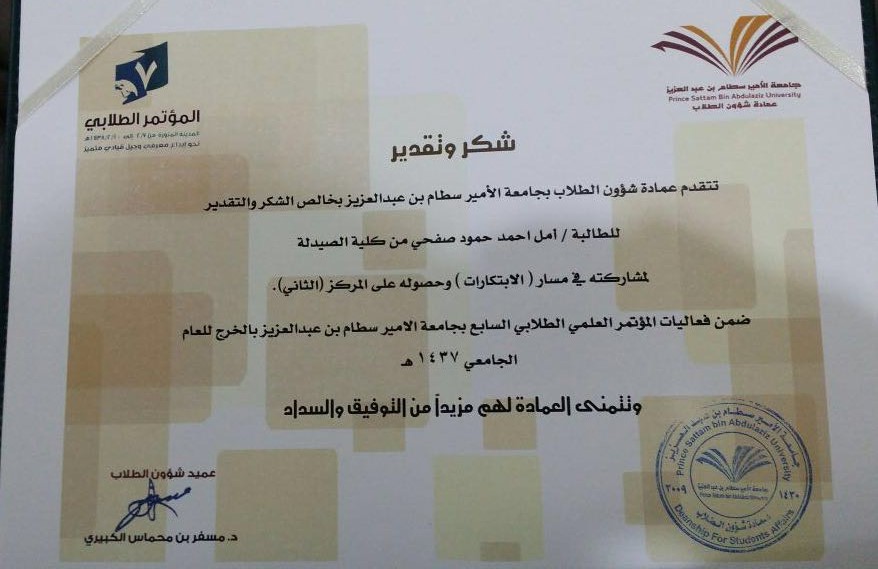 شاركت كلية الصيدلة شطر الطالبات في الملتقى الختامي للمؤتمر العلمي السابع لطلاب وطالبات التعليم بجامعة الأمير سطام بن عبدالعزيز والذي أقيم برعاية كريمة من معالي مدير الجامعة الدكتور عبد الرحمن بن محمد العاصمي ، حيث أحرزت الكلية المركز الثاني والثالث على مستوى الجامعة في " محور الابتكارات" من خلال مشاركتها " بمشروع نبات البابونج العشبي في معالجة ارتفاع ضغط الدم " حيث حقق المركز الثاني والذي شارك في إعداده طالبات الكلية وهن : أمل أحمد صفحي- شيخة سعود المقرن- نورة أحمد القرين حيث نتج عن هذا المشروع أن نبات البابونج أعطى نتائج قوية على حيوانات التجارب أفضل من الأدوية الموجودة في الأسواق وبدون أية أثار جانبية بالإضافة إلى أنه كان له تأثير قوي على المرضى المتطوعين حسب الجرعة المأخوذة، فكلما زات الجرعة زاد التأثير المخفض لضغط الدم