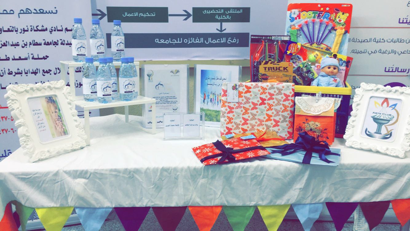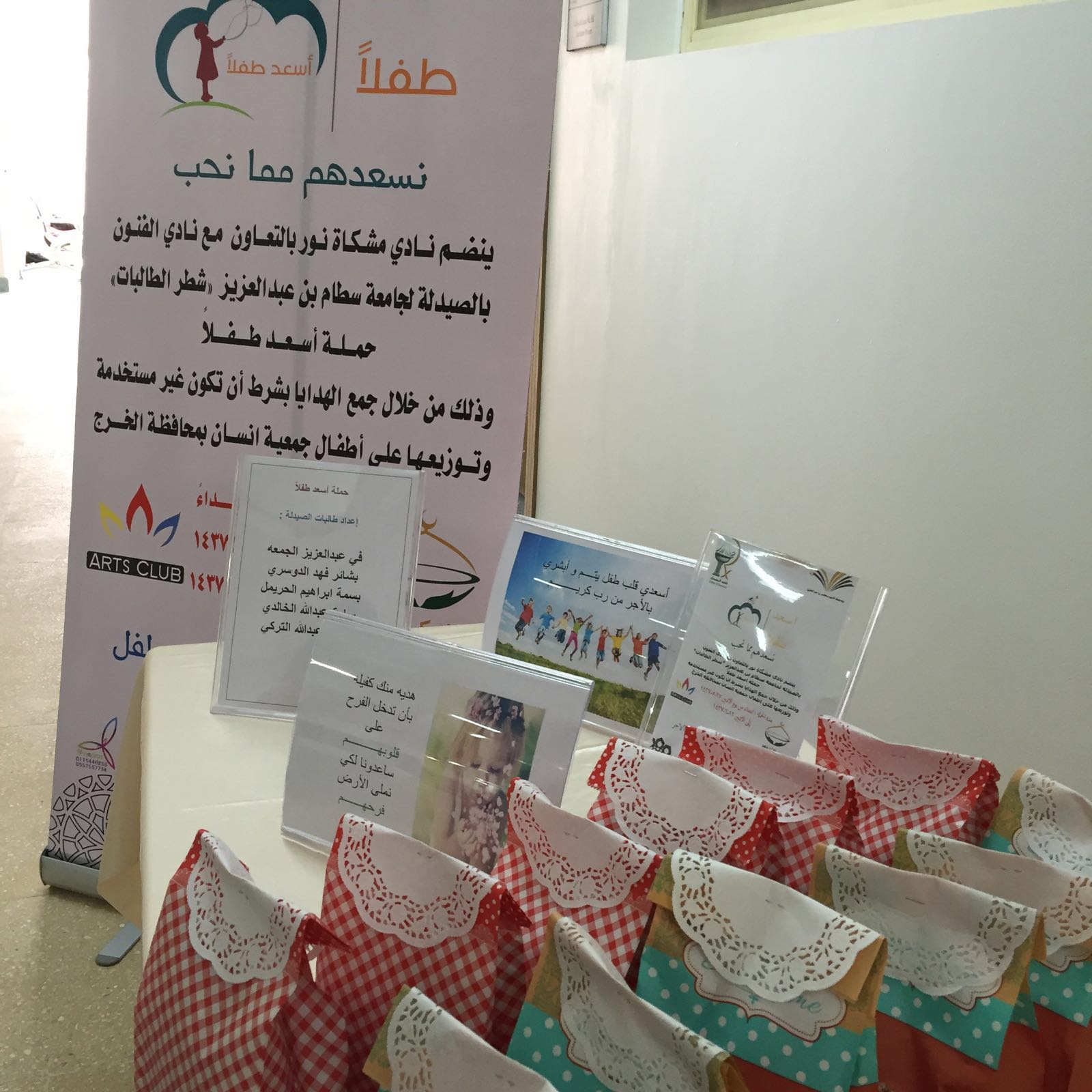 نظم نادي مشكاة نور بالتعاون مع نادي الفنون في كلية الصيدلة شطر الطالبات حملة "أسعد طفلاً" والتي تهدف إلى جمع الهدايا وتوزيعها على أطفال جمعية إنسان لرسم الفرحة والسرور على محياهم في كليه "العلوم الطبية التطبيقية "قسم التمريض "وكلية العلوم والدراسات الإنسانية ، وكلية إداره الأعمال، بالإضافة إلى كلية الصيدلة وقد لقيت الحملة تفاعلاً كبيرمن الطالبات وأعضاء هيئة التدريس
