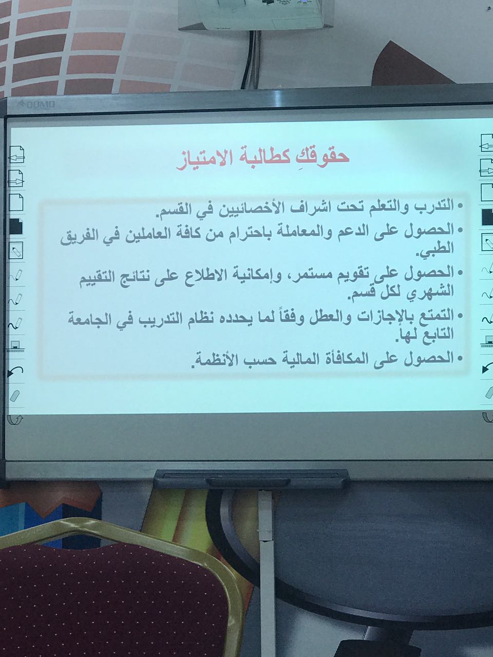 نظمت كلية الصيدلة شطر الطالبات بقاعة الأنشطة بالكلية محاضرة بعنوان (التميز في التدريب )بهدف رفع كفاءة طالبات التدريب وإعطائهن صورة كاملة عن التدريب في المستشفيات لطالبات المستوى السادس فما فوق و ذلك يوم الأثنين الموافق 26/5/1439ه م الساعة 12 ظهراً , حيث ألقتها كلا من أ. سارة المقرن مدرب معتمد أخصائية أشعة وناشطة تطوعية ، و صالحة الفيفي وهي محاضر في قسم الصيدلة الإكلينيكية، حيث سلطت الضوء أ.سارة المقرن على أهمية وأهداف ومزايا مرحلة التدريب وكيفية الإستعداد الأمثل لها واستغلالها كفرصة ذهبية بما يعود عليهن بالنفع لمستقبلهن الوظيفي وذلك حرصًا على تخريج طالبات متميزات يمثلن الجامعة خير تمثيل، تلى ذلك قدمت الجزء الثاني من المحاضرة أ.صالحة الفيفي تحدثت فيه عن مقررات التدريب الصيدلي الميداني 1 و2 وما يتضمنه من شرح للمهام اليومية للصيدلي في أقسام الصيدلة الخارجية وأقسام التنويم من تقديم الرعاية الصيدلية للمريض بطريقة علمية كشرح كيفية تناول الدواء والمحاذير الدوائية المتعلقة به وكيفية تحضير المحاليل الوريدية ونظام الجرعة الواحدة وفي نهاية المحاضرة تمت الإجابة على جميع استفسارات الطالبات ،كما أبدت الطالبات ثنائهن وشكرهن على تنظيم مثل هذه المحاضرة التي أضافت لهن الكثير