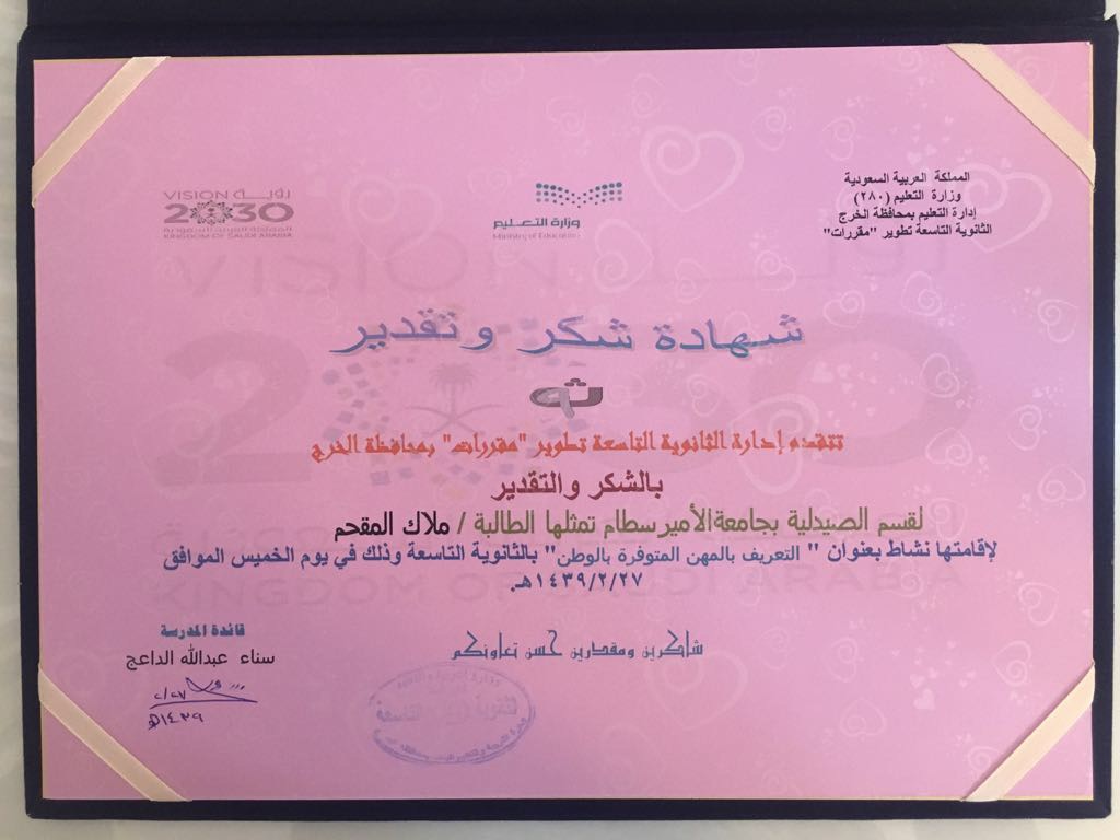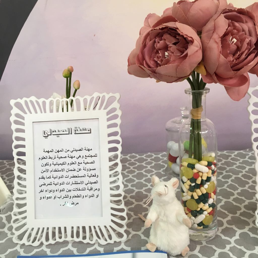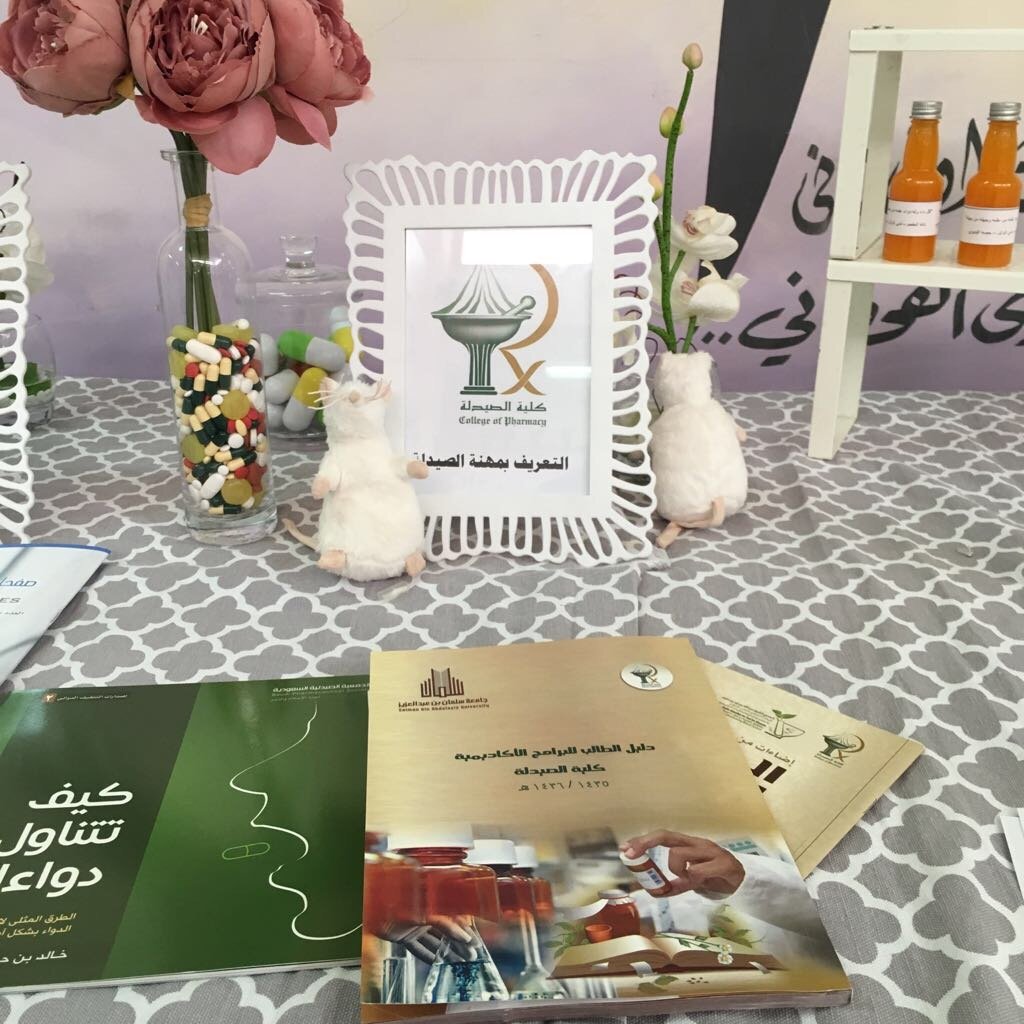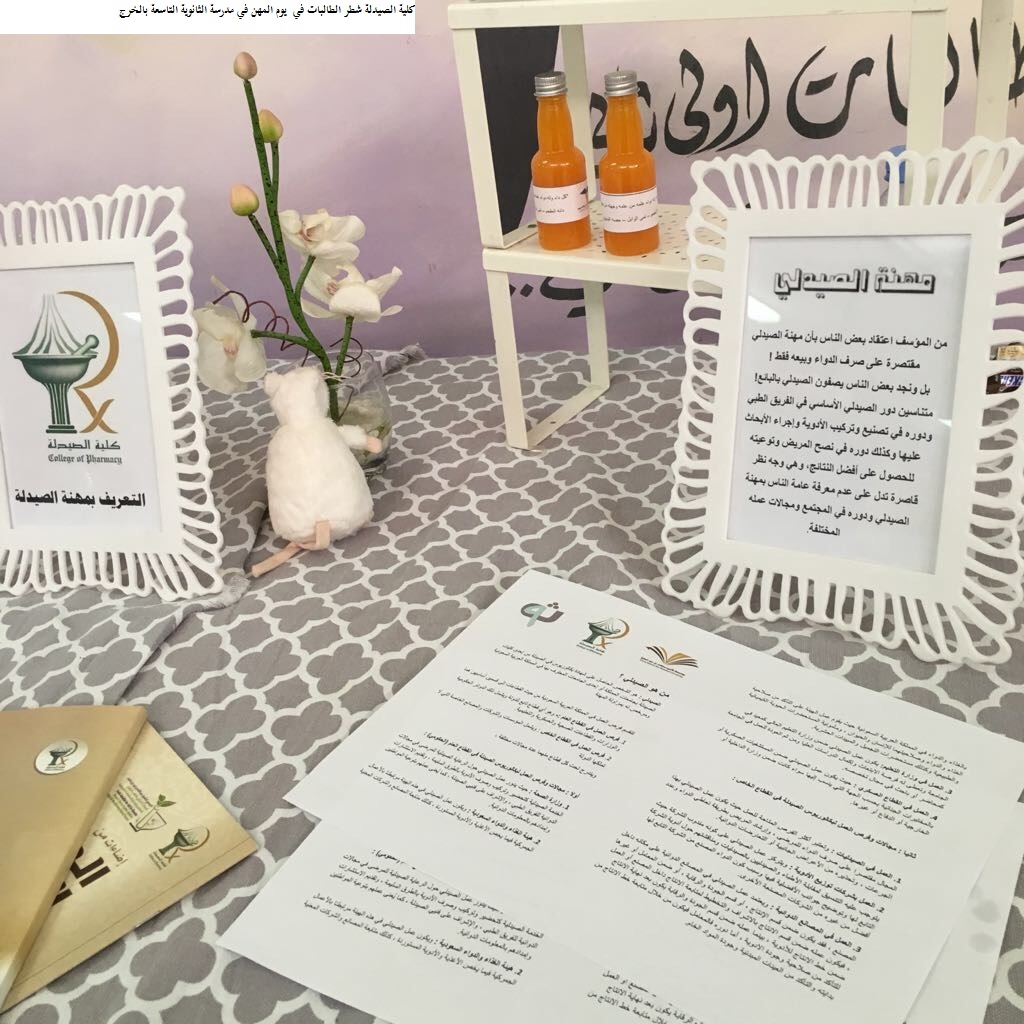 شاركت كلية الصيدلة شطر الطالبات في يوم المهن في مدرسة الثانوية التاسعة بالخرج يوم الخميس الموافق 27/2/1439ه وذلك ضمن أنشطة لجنة خدمة المجتمع فقد قامت الطالبة ملاك المقحم بتمثيل الكلية في ركن تعريفي بالكلية حيث شرحت للطالبات مهنة الصيدلة وما يقدمه الصيدلاني للمجتمع من خدمات بالإضافة إلى فرص العمل المتوفرة للصيدلاني بسوق العمل ثم وضحت للطالبات المقبلات على المرحلة الجامعية آلية الدراسة بالكلية والأقسام المتوفرة فيها وأجابت على جميع استفساراتهن مقدمة لهن النصائح اللازمة للدراسة و الحصول على القبول في الكلية وقد لاقى الركن تفاعلاً كبيراً من الطالبات وأبدين شكرهن للطالبة كذلك قامت إدارة المدرسة بتكريم الطالبة بشهادة شكر وتقدير.