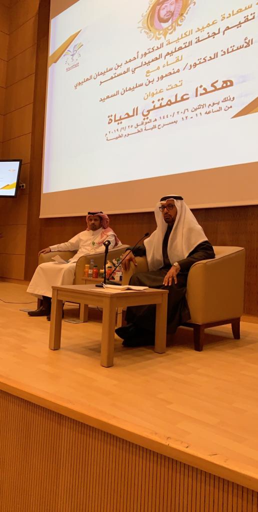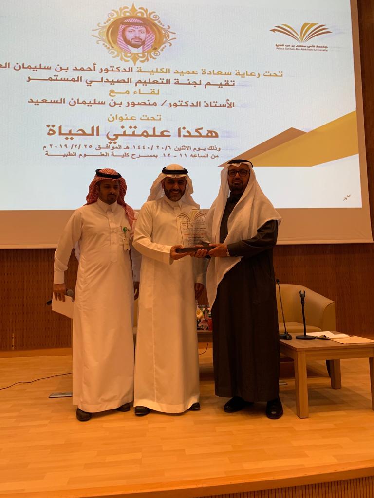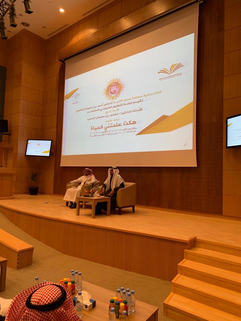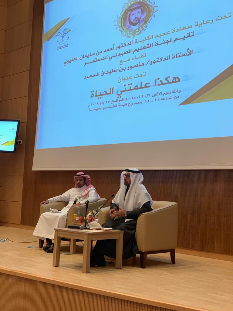 تحت رعاية سعادة عميد كلية الصيدلة الدكتور أحمد بن سليمان العليوى أقامت لجنة التعليم الصيدلي المستمر الكلية يوم الاثنين 20 / 6 / 1440هـ لقاء مع الأستاذ الدكتور منصور بن سليمان السعيد تحت عنوان "هكذا علمتني الحياة" بمسرح كلية العلوم الطبية التطبيقية بالخرج , بحضور أعضاء هيئة التدريس بكلية الصيدلة والطلاب.