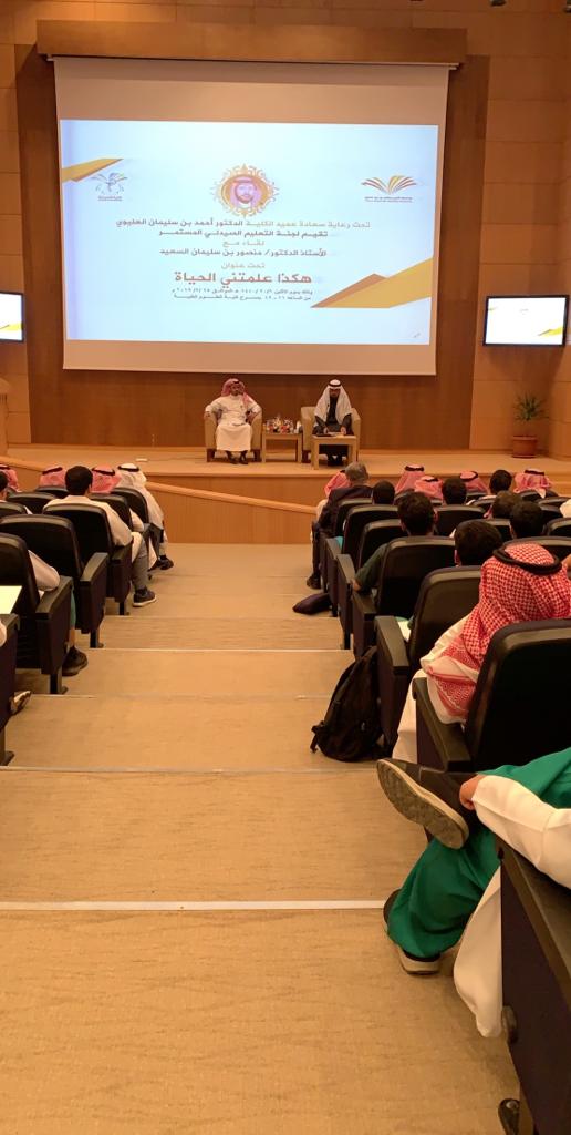 حيث نقل الدكتور خلال اللقاء خبرات وتجارب سنوات طويلة قضاها في العمل الأكاديمي والإداري بروح الأب والأخ الأكبر حيث مر الدكتور بجوانب مختلفة في حياته وخبراته التي اكتسبها كي تكون نقطة الانطلاق للأبناء , وفي نهاية اللقاء فتح المجال للمناقشات والتحاور مع الدكتور منصور للإجابة على أسائلة الحضور واستفساراتهم.