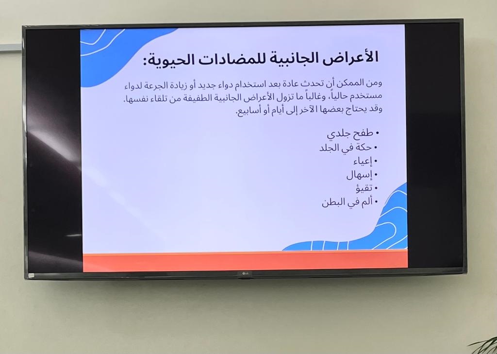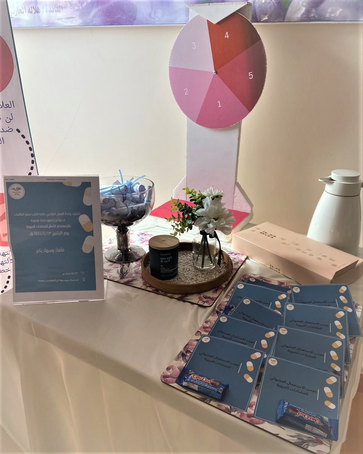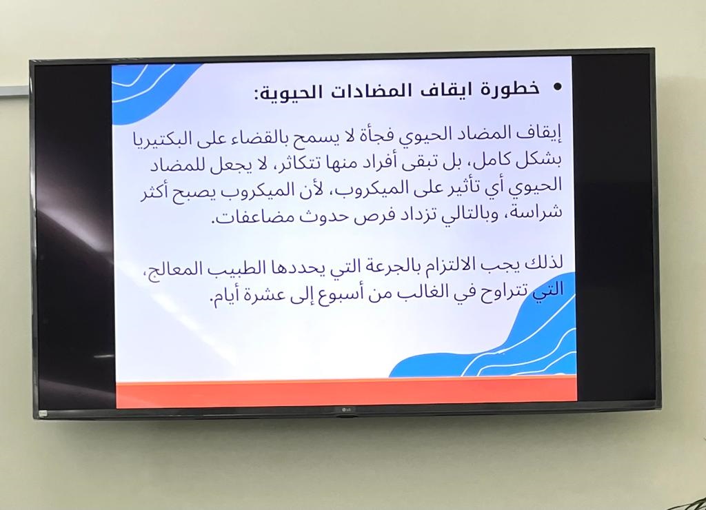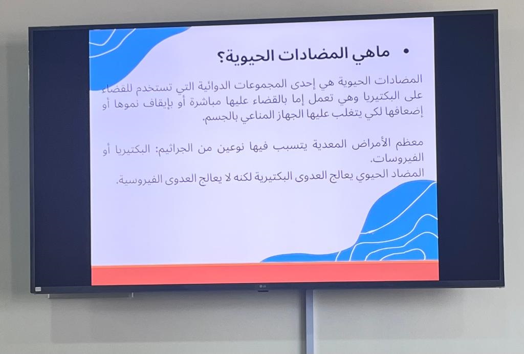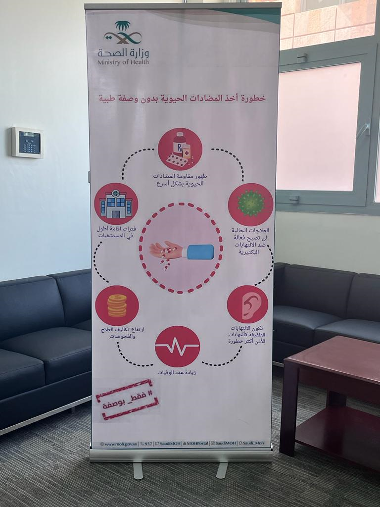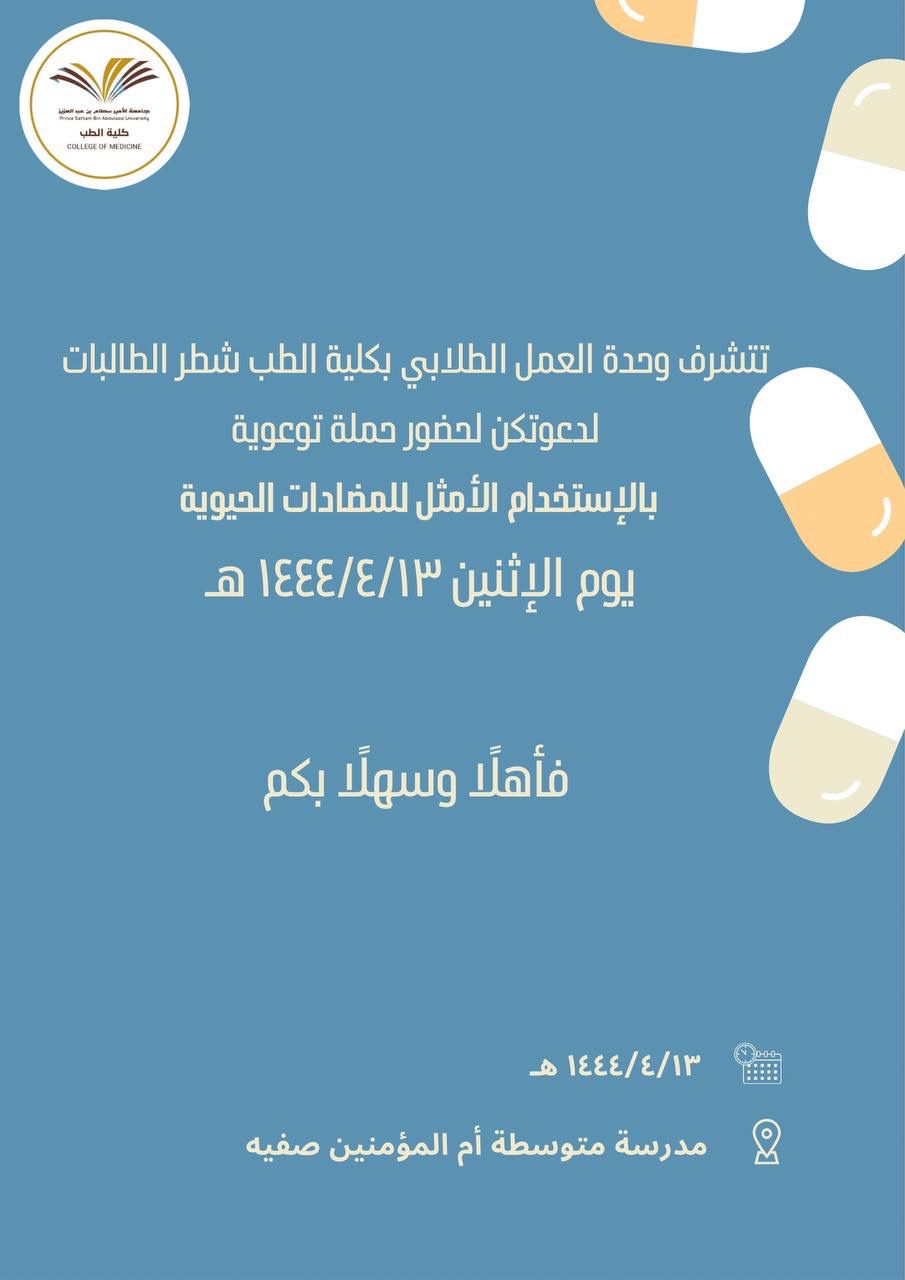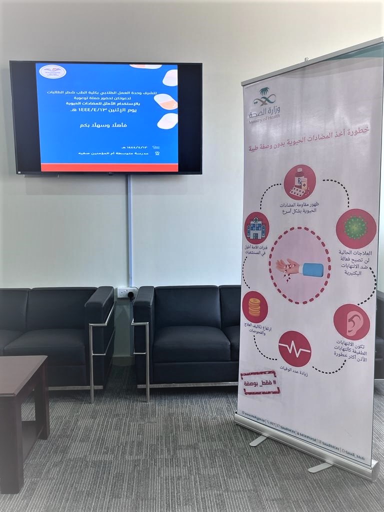 نظراً للأهمية الكبرى في تقنين استخدام المضادات الحيوية أقامت وحدة العمل الطلابي بكلية الطب شطرالطالبات بمتوسطة أم المؤمنين صفية بالخرج ركن توعوي يهدف إلى التوعية بلإستخدام الأمثل للمضادات الحيوية وطرق استخدامها بالشكل الصحيح وأن مقاومتها من أكبر التهديدات التي تواجهنا اليوم وأن اتباع هذه النصيحة البسيطة سيساعد في الحفاظ على عمل المضادات الحيوية بشكل سليم .