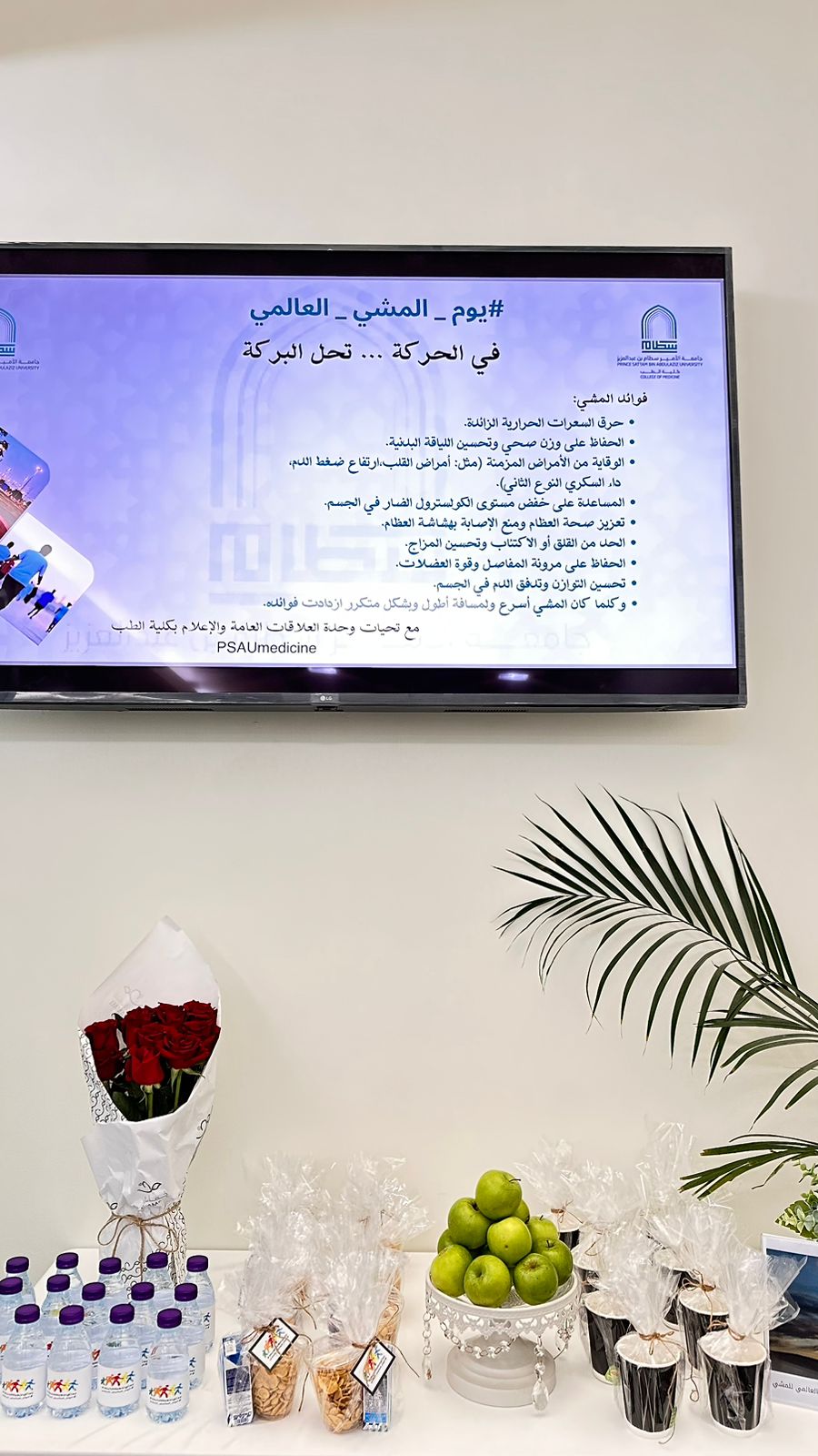 نظمت كلية الطب لشطر الطالبات بجامعة الأمير سطام بن عبدالعزيز فعالية اليوم العالمي للمشي في مقر كلية الطب لشطر الطالبات في يوم الأحد الموافق 29 / 10 / 2023، وذلك تعزيزًا لدورها في تنمية الرياضة المجتمعية وتفعيل ممارسة المشي بين أوساط المجتمع الأكاديمي.