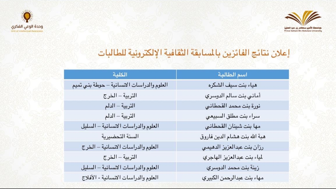 كما فازات من طالبات الكلية كل من: نورة بنت محمد القحطاني و سراء بنت مطلق السبيعي في المسابقة الثقافية الالكترونية للطالبات.