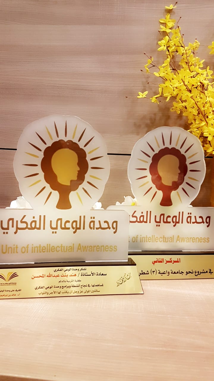 حيث حصلت كلية التربية بالدلم على المركز الثاني على مستوى الجامعة في تنفيذ برامج وأنشطة الوعي الفكري بمتابعة من عميدة الكلية الدكتورة/ مليحة بنت محمد القحطاني و بإشراف مباشر من الأستاذة/ هند بنت عبدالله ال محسن.