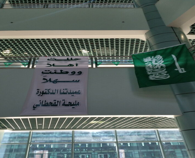 وفي ختام الحفل قدمت عميدة الكلية د.مليحة القحطاني كلمة دعت فيها الجميع إلى شكر الله والإخلاص في العمل لخدمة الدين والوطن، وأن نكون قدوة حسنة للأجيال القادمة فبالشكر تدوم النعم ,وذكرت أن المواطنة الحقّة هي التي تخدم وطننا في أي مجال من مجالات العمل التي ننتمي إليها ونبذل ما بوسعنا لتكون أعمالنا خالصة لوجهه الله الكريم، وأن تساهم في تربية جيل قادم يحب وطنه ويشعر بالانتماء إليه من خلال ترسيخ القيم الوطنية، والاعتزاز بالدين والولاء للمليك، والتذكير بنعم الله على وطننا، ومنها الأمن والأمان والاستقرار;وما نحن فيه من نعم يستوجب علينا شكرها والمحافظة على ما أنعم الله به علينا من نعمة الانتقال إلى المبني الجديد. ودعت إلى المحافظة على هذه النعمة بصيانتها وشكر الله عليها ، وفي ختام كلمتها شكرت جميع القائمين على تنظيم الحفل على جهودهن المبذولة في تفعيل تلك المناسبة الغالية علي قلوبنا. بعد ذلك قامت الطالبات بإنزال العبارات التحفيزية من الأدوارالعلوية بالمبنى على البهو الداخلي ، وفي نهاية الحفل قدمت منسوبات الكلية من طالبات وموظفات التهاني لعميدة الكلية د.مليحة القحطاني بمناسبة ثقة معالي مدير الجامعة د.عبدا لرحمن العاصمي بتكليفها عميدة للكلية ، و افتتاح المبنى الجديد سائلين المولى القدير أن تكون سنة خير وتوفيق على الجميع .