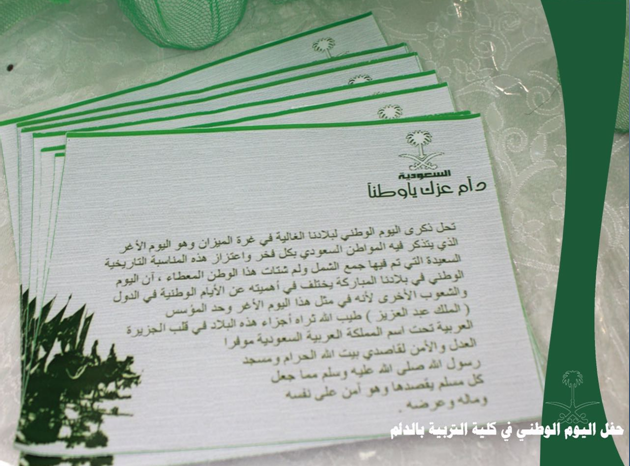 حيث احتوى البرنامج على العديد من الفعاليَّات المنوَّعة ، إلى جانب فقرات الإلقاء، والأناشيد الوطنيَّة، والعروض المرئيَّة لمنجزات الوطن ,ووقفة شكر وعرفان لجنودنا البواسل في الحدّ الجنوبي ,وإبراز دور المملكة و ماتبذله في خدمة حجاج بيت الله الحرام كل عام .