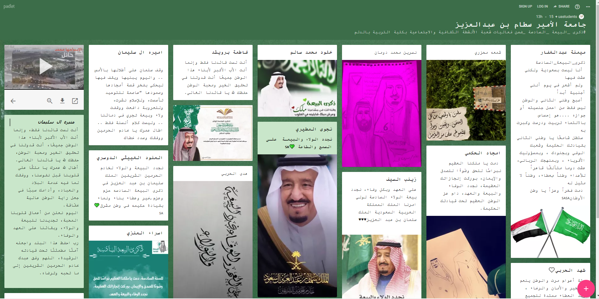 - وعقب ذلك أعُلن عن (الحائط الإلكتروني يوم الاحد الموافق 29-3-1442) كما شاركت مجموعة من الطالبات في التعبير عن مشاعرهن بأعمال منها رسائل خطية ورسومات وعبارات وطنية مرفق لكم رابط الدخول للحائط الالكتروني https://padlet.com/uastudents/hspe0qezqyqvctq