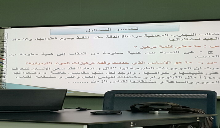 نظمت وحدة خدمة المجتمع بالجودة بالتعاون مع قسم الكيمياء دورة تدريبية لتنمية مهارات فنيات المختبر بالمدارس الحكومية من إعداد وتقديم كلاً من د.أمل عبد الفتاح نصار رئيسة قسم الكيمياء ، ود. جيهان عبد الرحمن حمودة ، ود. إنصاف عامر الفلالي أعضاء هيئة تدريس بالقسم ، يوم الأحد الموافق 27/6/1438هـ ، الساعة التاسعة صباحاً بمعامل قسم الكيمياء .