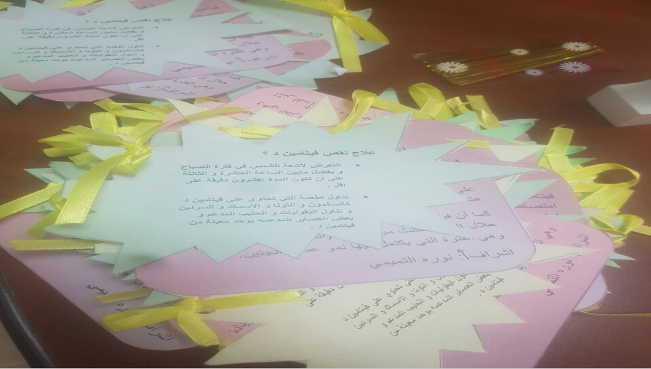 نظمت وحدة خدمة المجتمع بالجودة وبالتعاون مع قسم الاقتصاد المنزلي ورشة عمل لتوعية طالبات المرحلة الابتدائية بأهمية فيتامين (د) من إعداد وتقديم أ.نورة التميمي، يوم الخميس الموافق 6/10 /1438هـ ، من 8.30 صباحاً إلى 12.30ظهراً ، بمكتب الإشراف بالدلم .