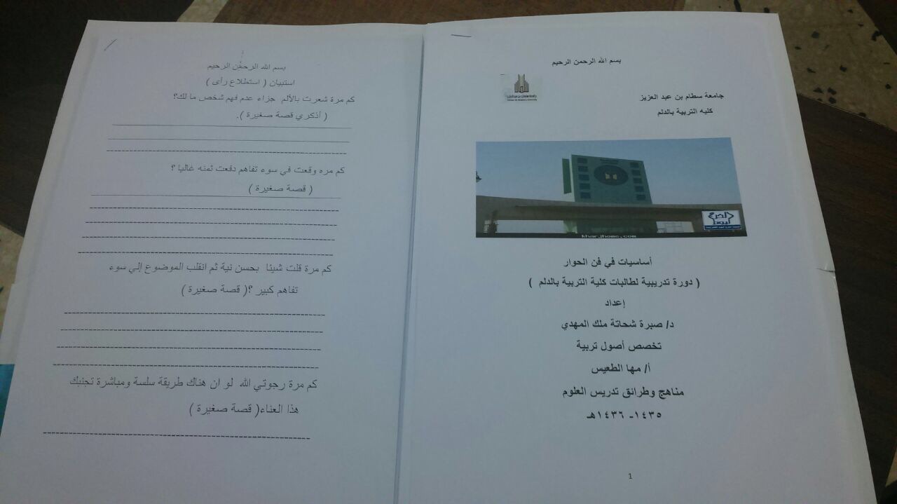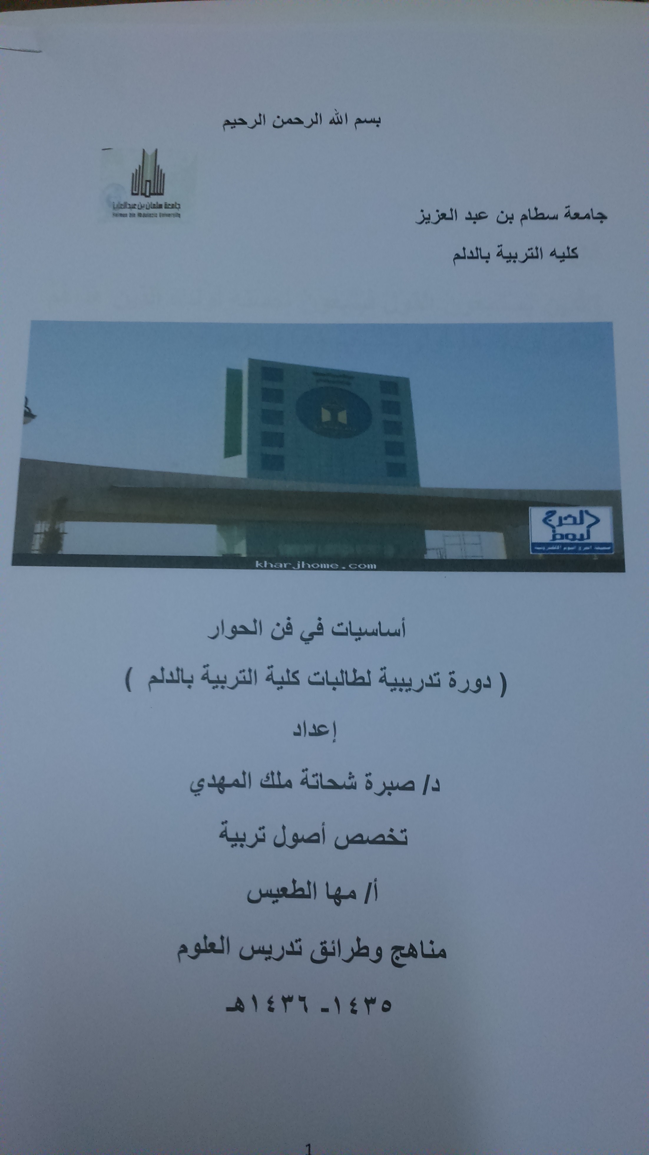 أقام قسم العلوم التربوية بكلية التربية بالدلم دورة بعنوان (أساسيات في فن الحوار) لمدة خمس ساعات من الساعة التاسعة إلى الساعة الواحدة ظهرًا، وقد قدمت الدورة سعادة الدكتورة صبره شحاتة من أصول التربية وسعادة الأستاذة مها الطعيس من مناهج وتدريس العلوم.