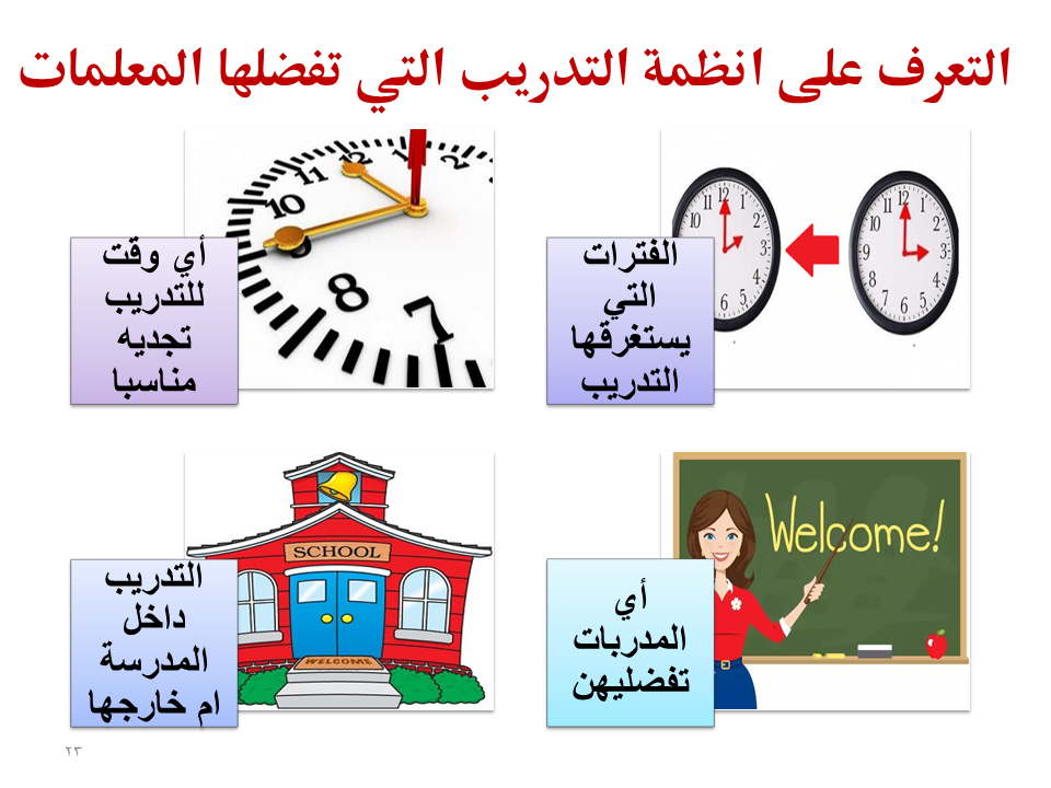 التعرف على الاحتياجات التدريبية لمعلمات ومشرفات المراحل الدراسية الثلاثة من جهة نظرهن، واستطلاع آرائهن حول توقعاتهن لطبيعة ونوعية البرامج التدريبية التي يشعرن بحاجتهن اليها.