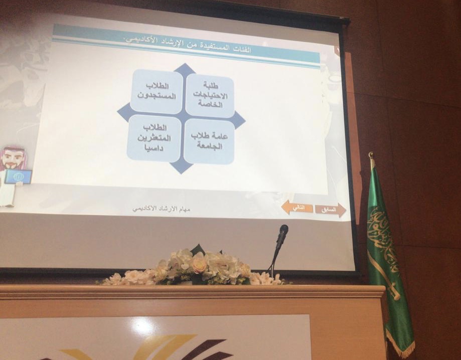 وفي اليوم الثاني استضافات الكلية الأستاذة هدى الجليفي مسؤولة وحدة الارشاد الأكاديمي بالجامعة لتقديم البرنامج التثقيفي للإرشاد الأكاديمي، بعدها أجابت الأستاذة هدى عن أسئلة الطالبات.